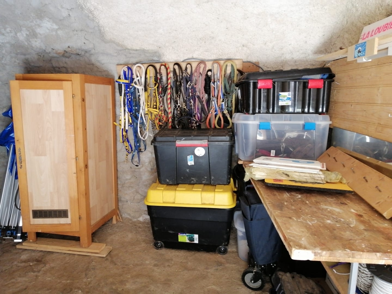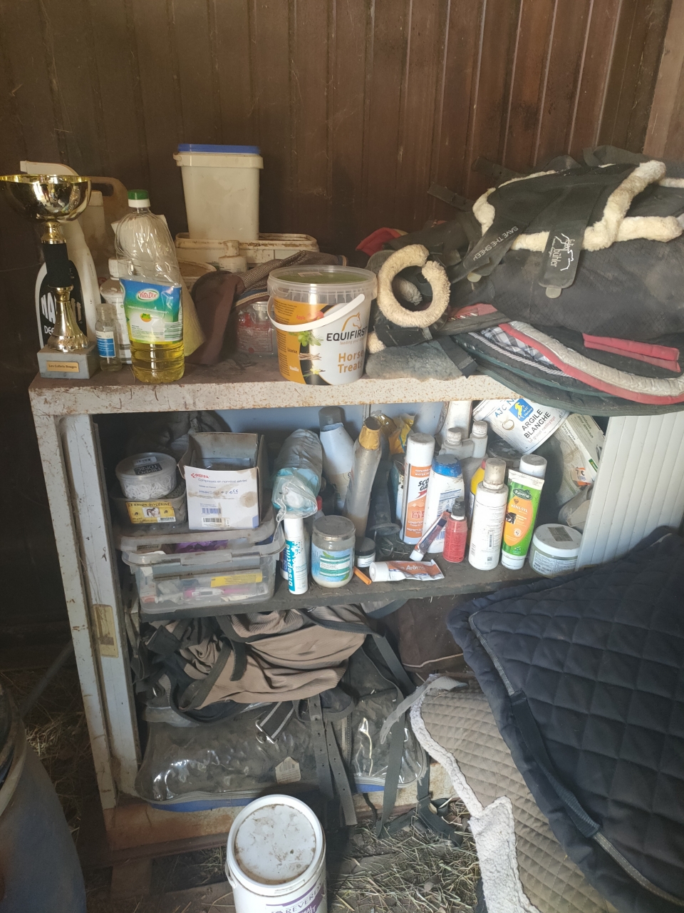| Dire merci | Lien J'allais te remettre une photo de ma sellerie, mais tu la connais. J'ai récupéré aussi un meuble de cuisine que je trouve pratique pour ranger tout le bazar, la pharmacie, les produits de soin, les pots de graisse, etc... et le plan de travail fait une table bien pratique pour poser des choses (en ce moment j'écris mon attestation dessus avant de partir en balade ) |