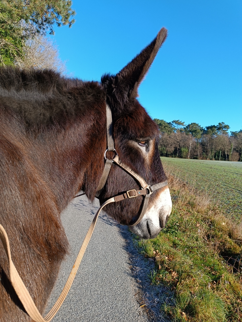 | Dire merci | J'ai oublié de raconter la sortie d'il y a quelques jours. Cet âne est extraordinaire. J'avais prévu de l'emmener seul en balade en partant avec le van, sauf que'mon véhicule n'a jamais voulu démarrer... La batterie a pas aimé le froid... Bon, alors improvisation totale, j'ai ressorti les longues rênes hors d'âge qui n'avaient pas servi depuis plus d'un an. Branchées au licol et go. Il n'avait RIEN oublié... Marcher, droite, à gauche, en arrière, arrêt, un régal... à la voix et une main dans la poche. On est partis 1h30, il avait l'air heureux, c'était trop bien. Je ne cesse de regretter qu'il soit si fragile car vraiment, rien ne nous arrêterait tous les deux... ![]() Là il est douloureux d'un pied, et c'est encore pire depuis le passage du maréchal. Problème non identifié, mystère. |