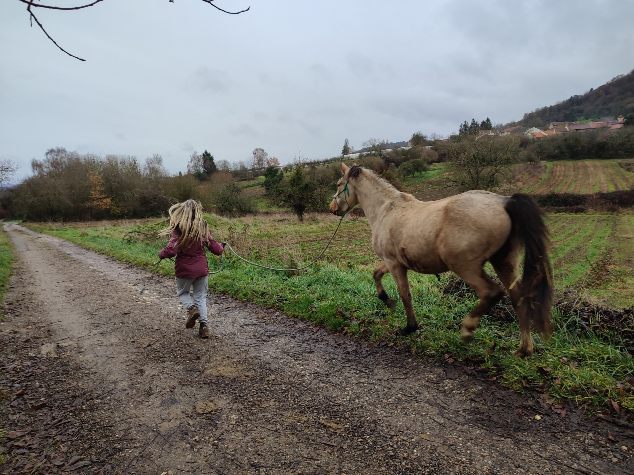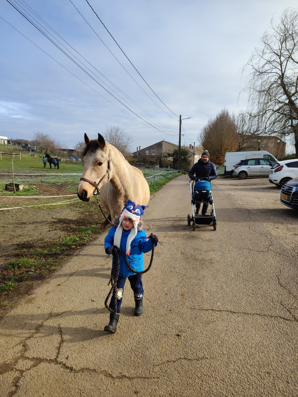 | Dire merci | Punaise t’es courageuse de marcher le poulain avec ta fille! ![]() Mais c’est bien d’arriver à garder la rythme! |