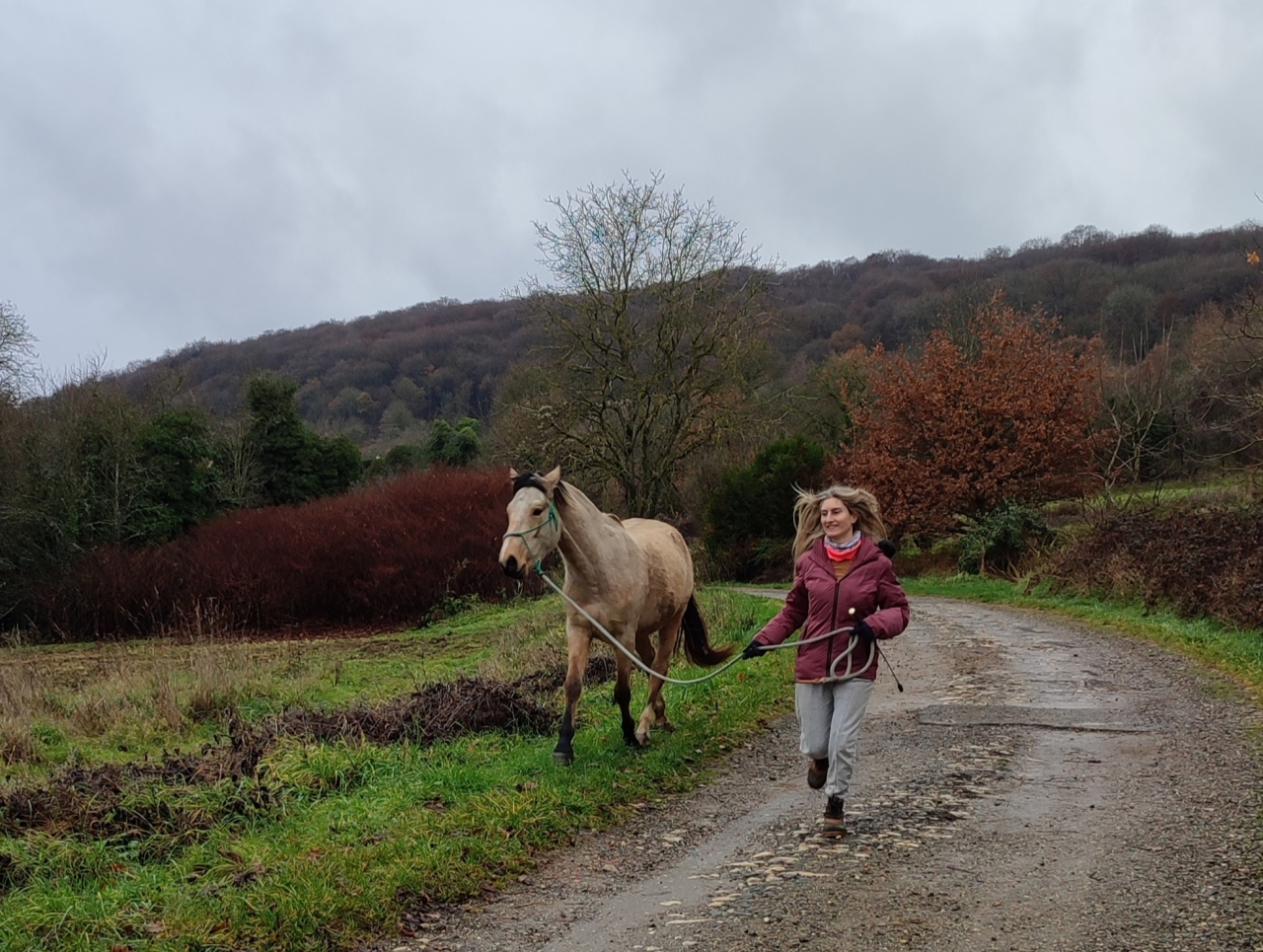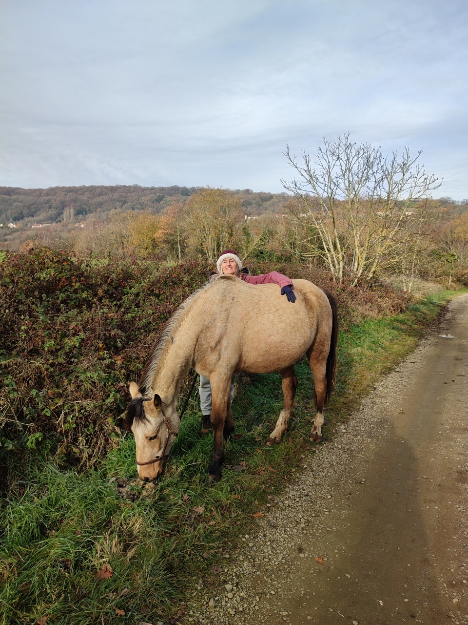 | Dire merci | ce poney !Ajd balade en famille. Nobel tjs cool même si je sentais parfois qu'il avait envie d'avancer plus vite.. J'ai tenté, je dis a mon mari , je cours un peu avec lui on va voir de que ça donne !j'imaginais un léger débordement... Même pas ! Au trot, nickel, on a même sur la fin alterné petit trot / grand trot et arrêt... Parfait ! Il est bluffant. Et jsuis contente car ça veut dire qu'on va pouvoir continuer a balader l'hiver qu'il arrive qd même assez bien a gérer l'excitation. Il a plus de mal a gérer la frustration de pas brouter tt le temps Et qui dit mari dit qq photos ![]() ![]() ![]() ![]() |