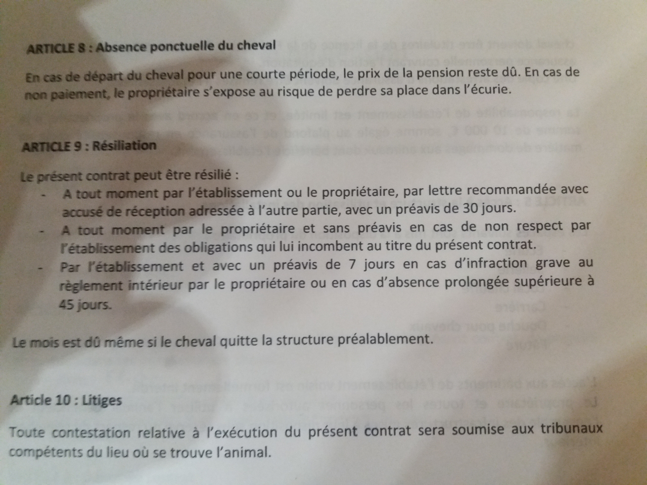 | Dire merci | "A tout moment par le propriétaire pour non respect par l'établissement des obligations qui lui incombent".... Perso j'estime que nourrir un cheval ça fait partie des obligations d'une pension ![]() |