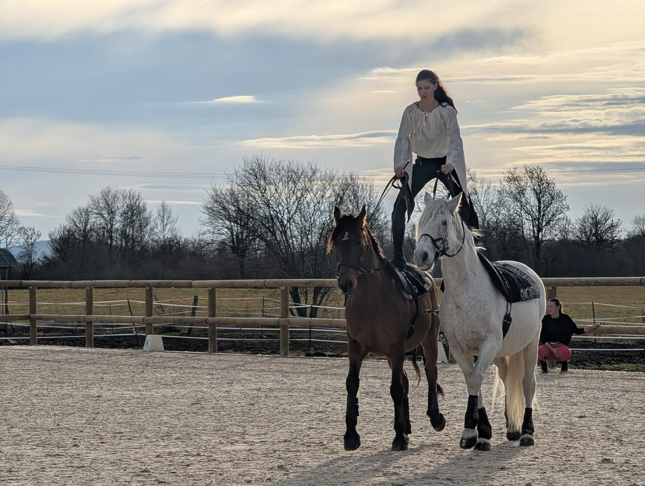 | Dire merci | Après à savoir que je ne poste qu'au trot pour le moment. Ce numéro me brasse vraiment, je l'avais produit à l'époque par défi suite à un stage dans une équipe de cascadeurs qui m'avaient un peu malmené en me disant en résumé que je serais toujours bonne qu'à faire des jambettes, et au final 10 ans après me voilà à former ma 3ieme paire mais je ne suis pas une ténor du tout, ils sont certes sans mors mais on va qu'au pas et au trot, ils sont attachés, on fait de graaaandes courbes Après voilà je ne suis plus au Puy du Fou non plus on fait à notre niveau et c'est déjà très bien ! |