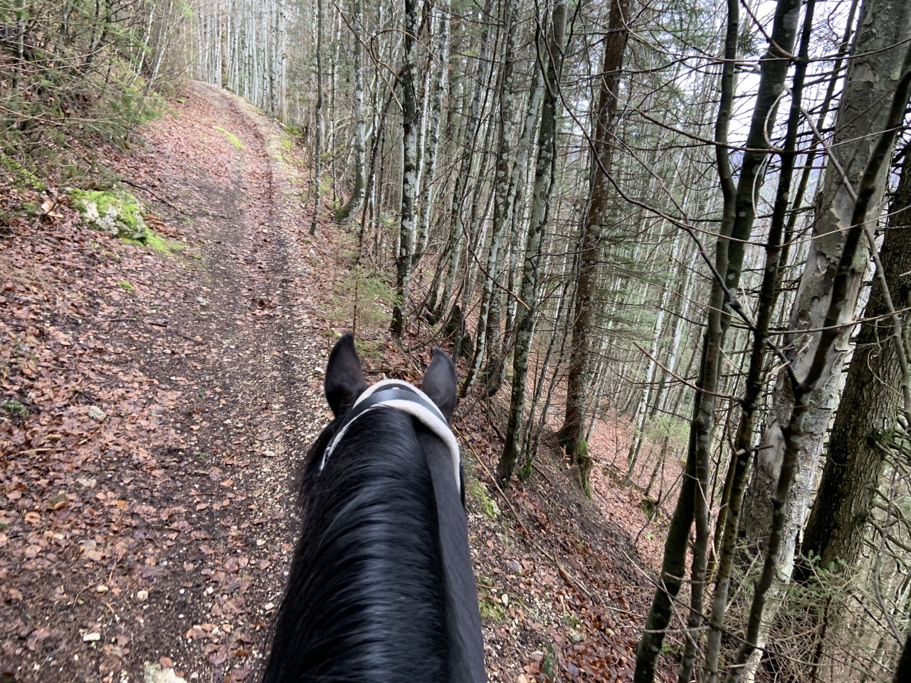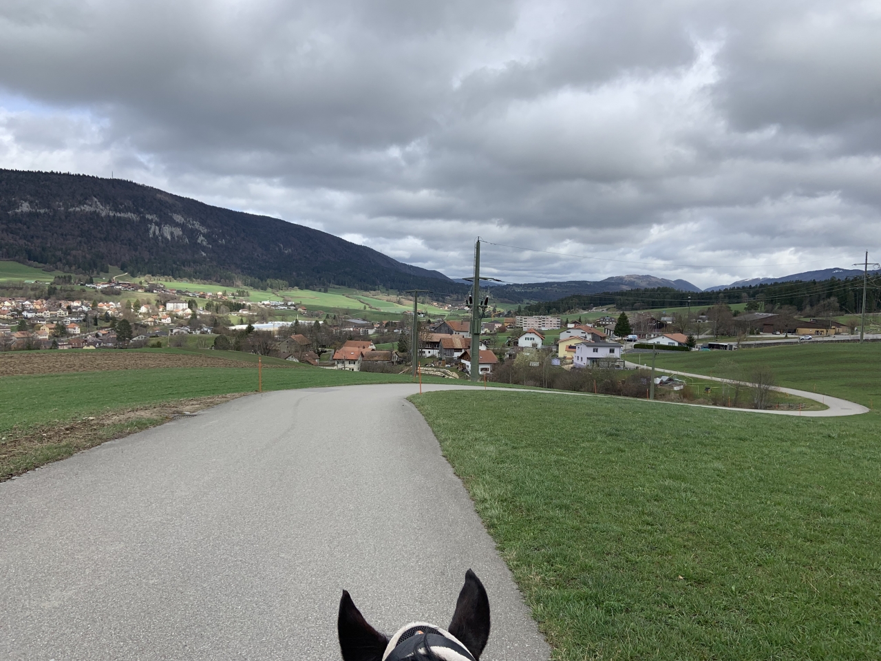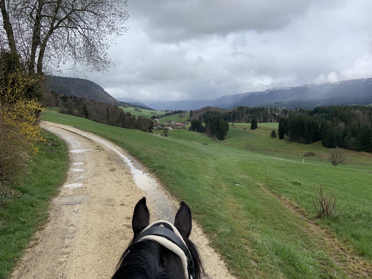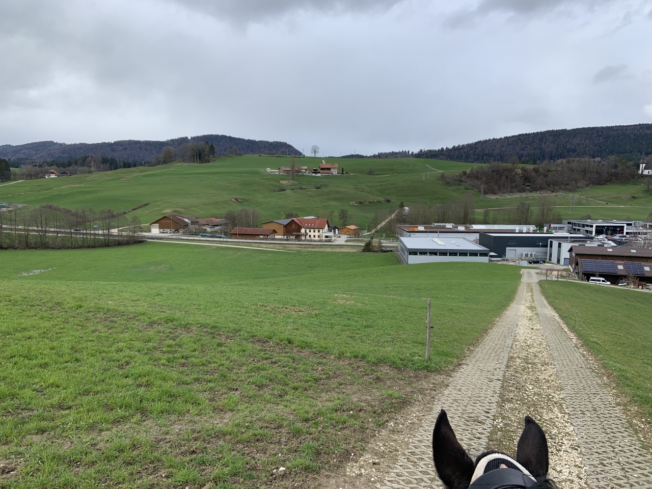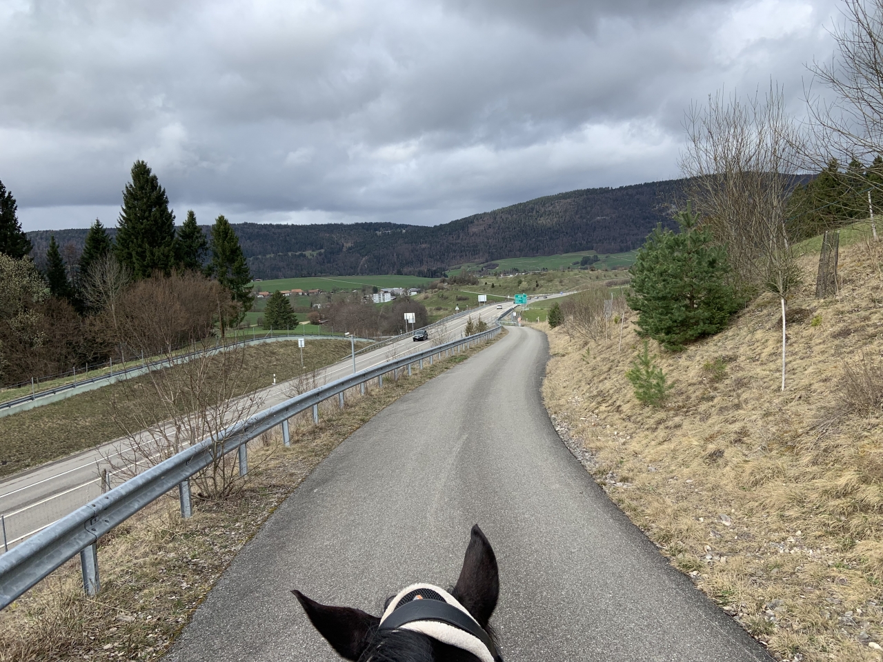 | Dire merci | Dernier bout de descente avant de sortir de la foret, là par contre ça se fait à pied.![]() C'est par là ? ![]() Il ne perd jamais le nord, miam le sapin ![]() Arrivés en bas, un arbre est tombé en travers du chemin, impossible de passer, on doit remonter un bout et faire un détour. On rejoint la route goudronnée qui rejoint la métairie sur la montagne. Elle est praticable à cheval mais il y a du trafic, c'est lourd. ![]() Vue sur le village où est située l'écurie. Au fond, ça mène aux Franches-Montagnes. Nous sommes aussi dans le berceau de la race, il y a pas mal de petits élevages dans le coin même si la majorité est produite pour la viande. ![]() |