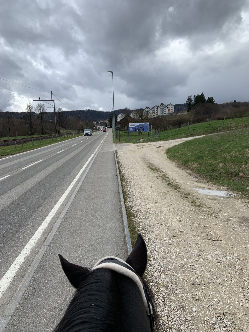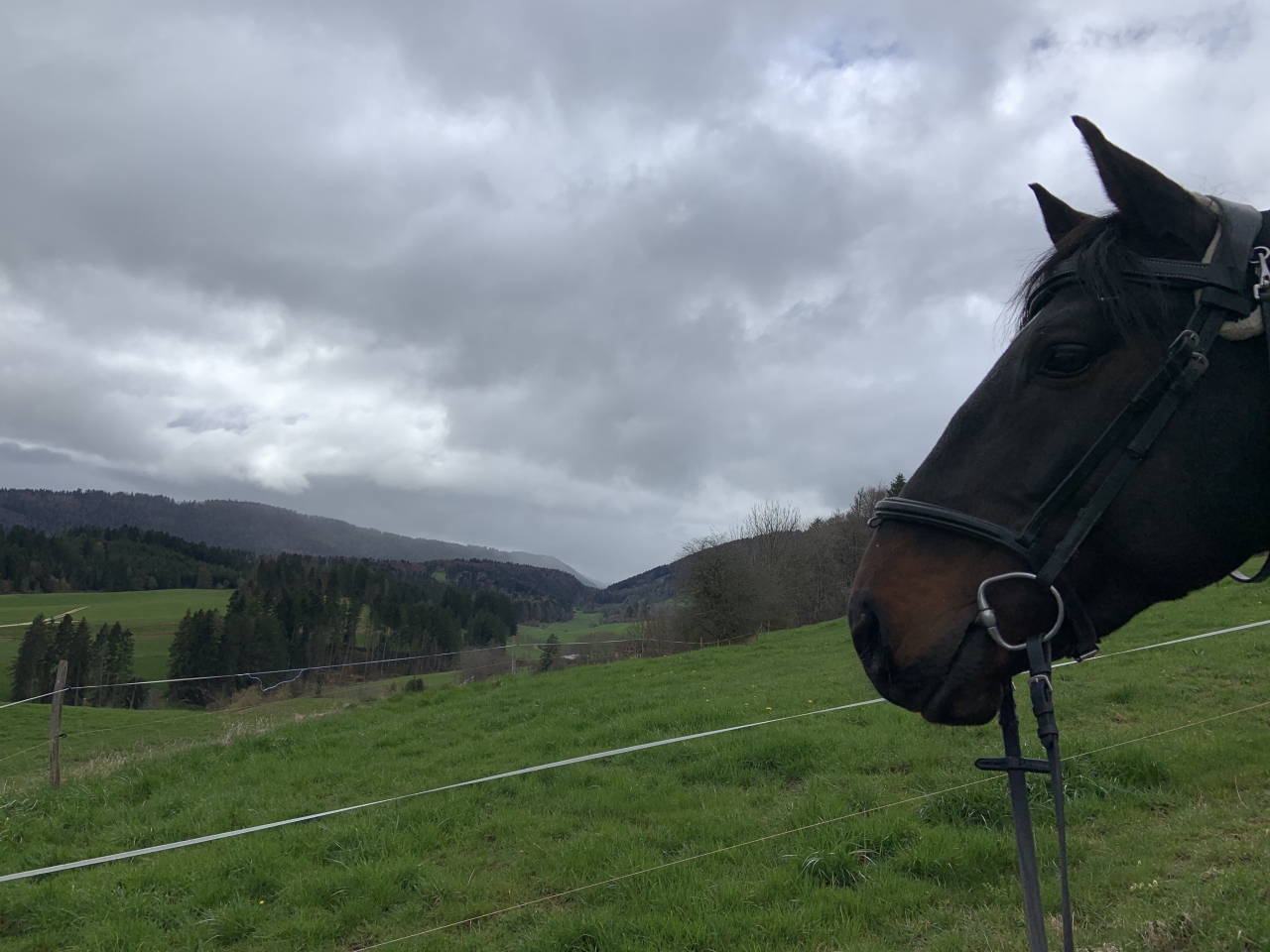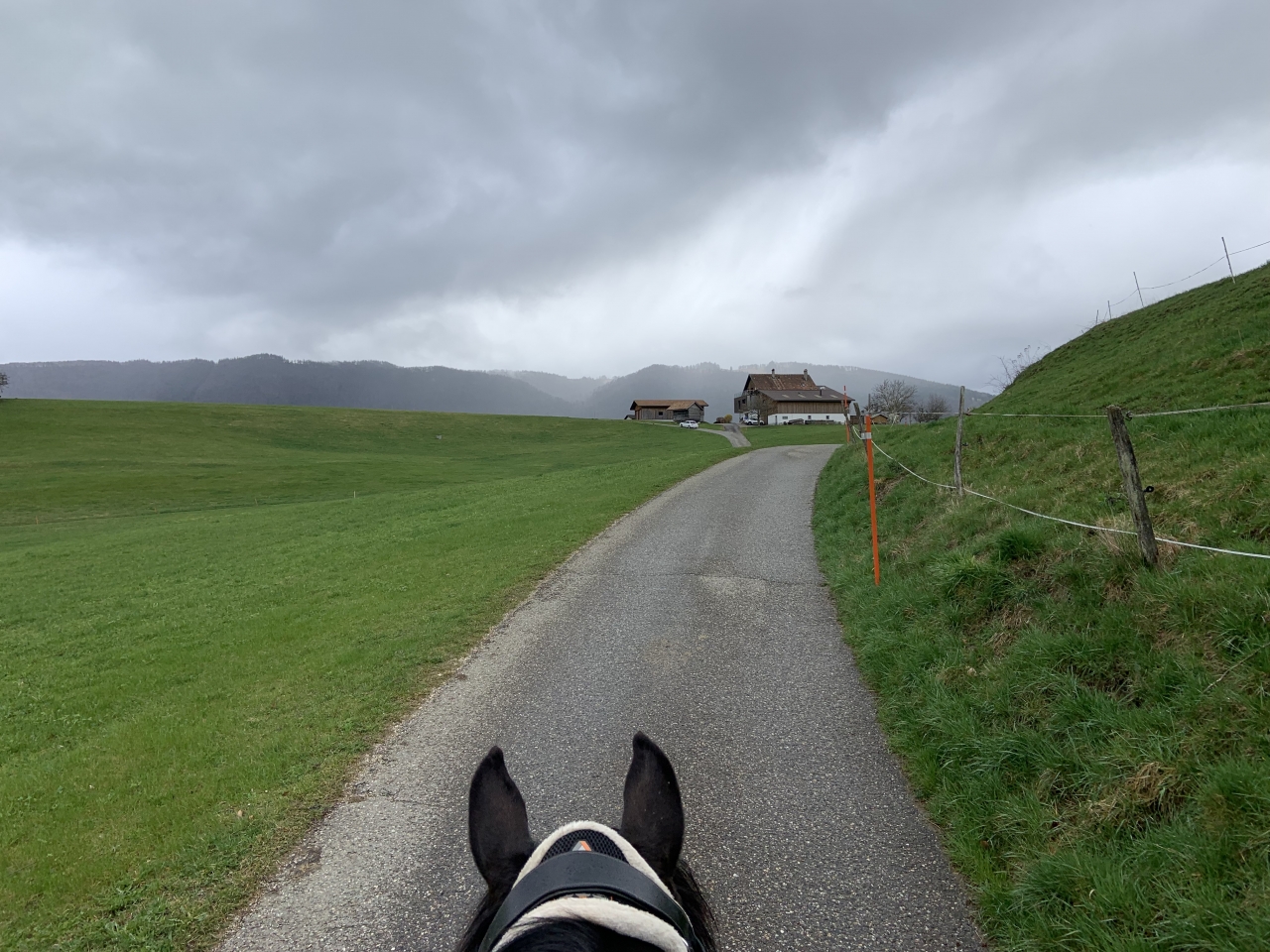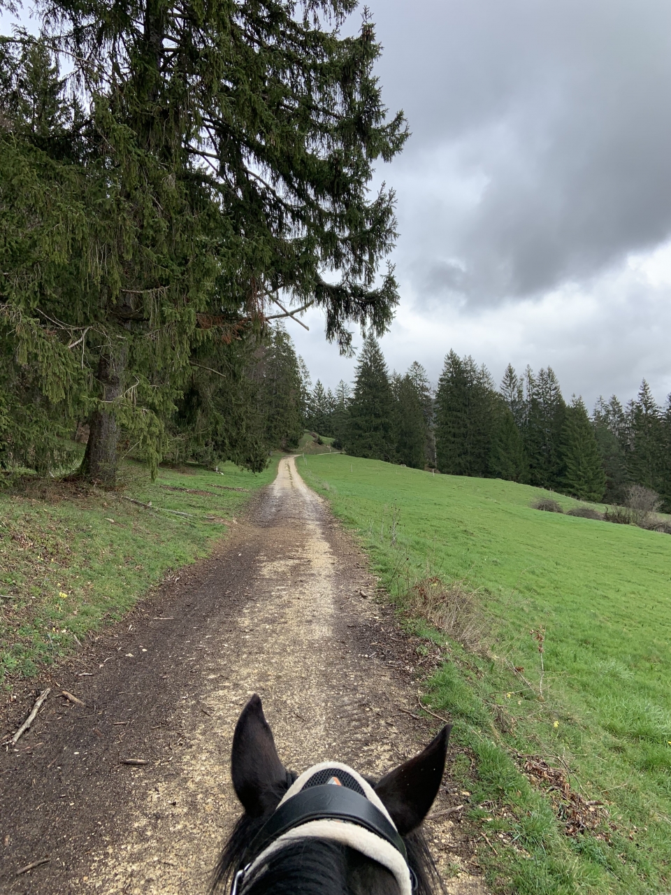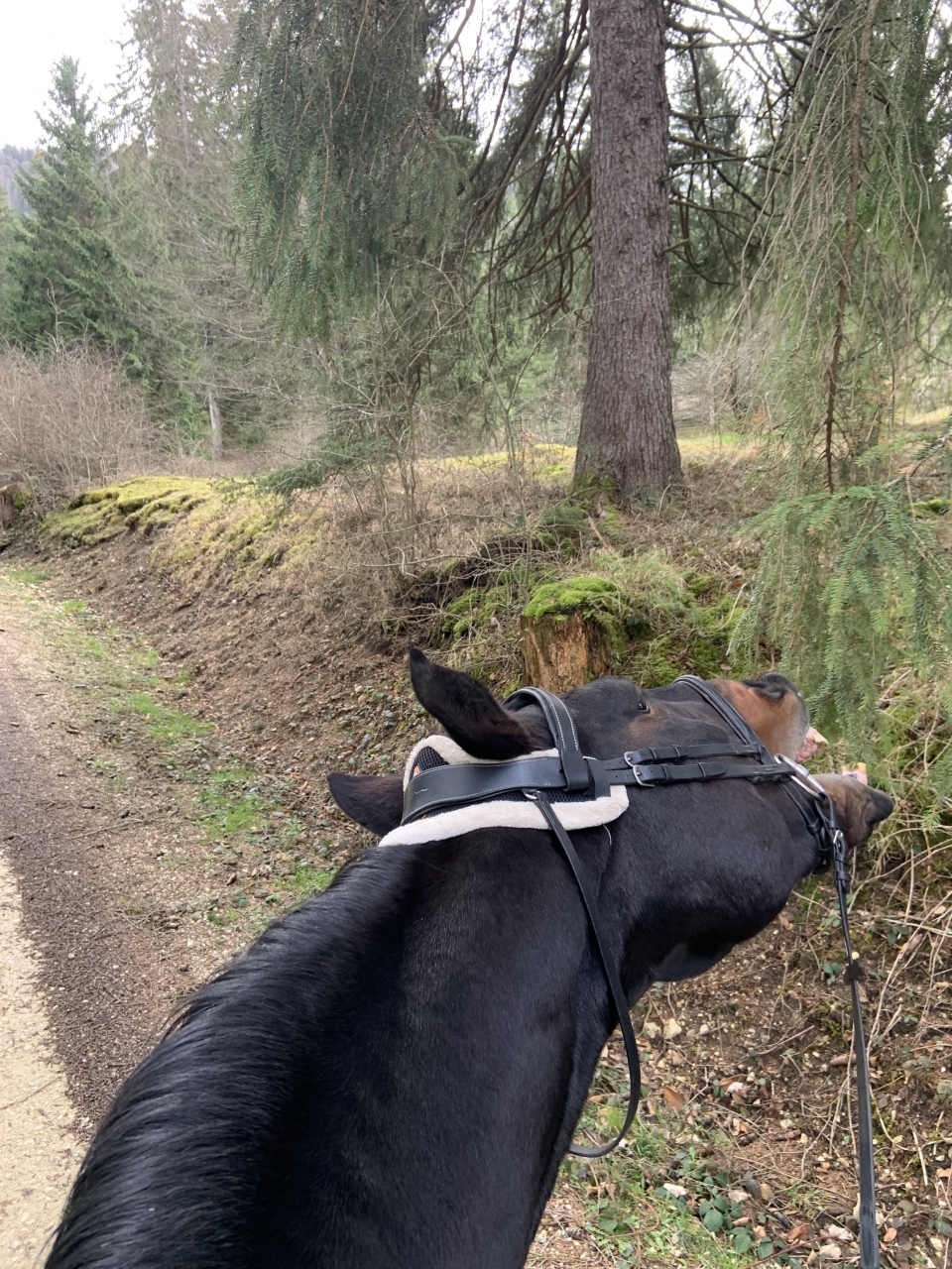 | Dire merci | Dernier bout de descente avant de sortir de la foret, là par contre ça se fait à pied.![]() C'est par là ? ![]() Il ne perd jamais le nord, miam le sapin ![]() Arrivés en bas, un arbre est tombé en travers du chemin, impossible de passer, on doit remonter un bout et faire un détour. On rejoint la route goudronnée qui rejoint la métairie sur la montagne. Elle est praticable à cheval mais il y a du trafic, c'est lourd. ![]() Vue sur le village où est située l'écurie. Au fond, ça mène aux Franches-Montagnes. Nous sommes aussi dans le berceau de la race, il y a pas mal de petits élevages dans le coin même si la majorité est produite pour la viande. ![]() |