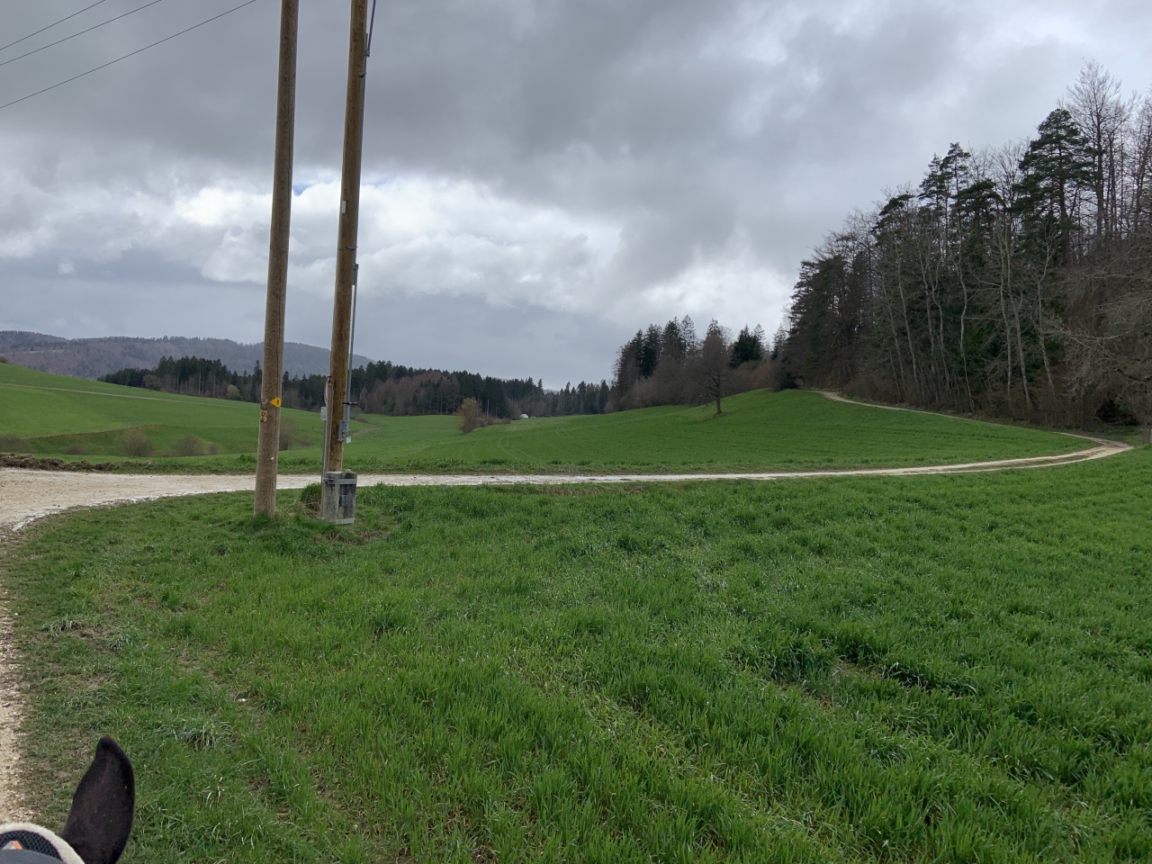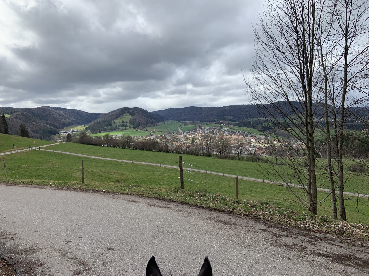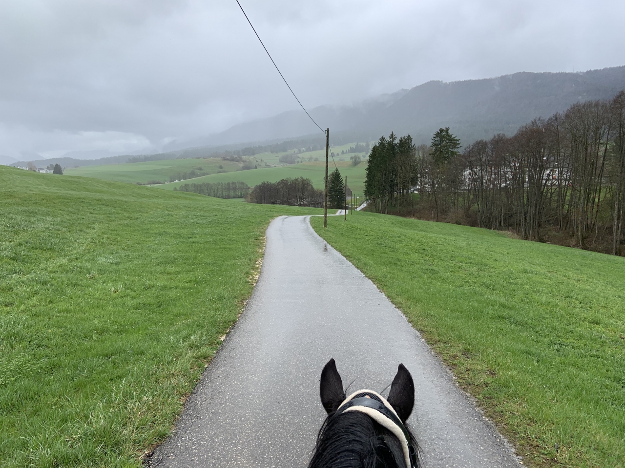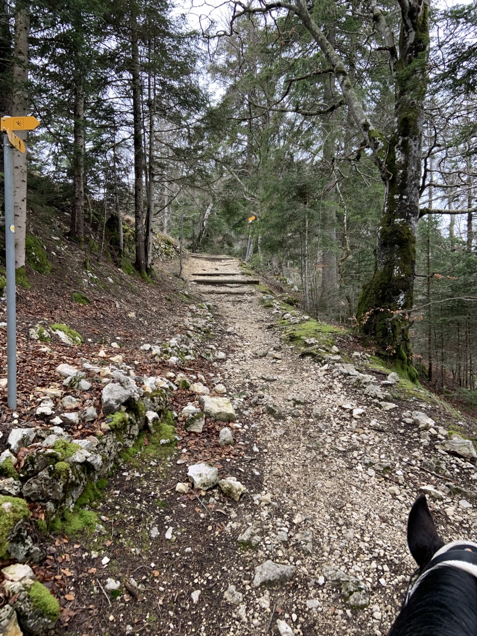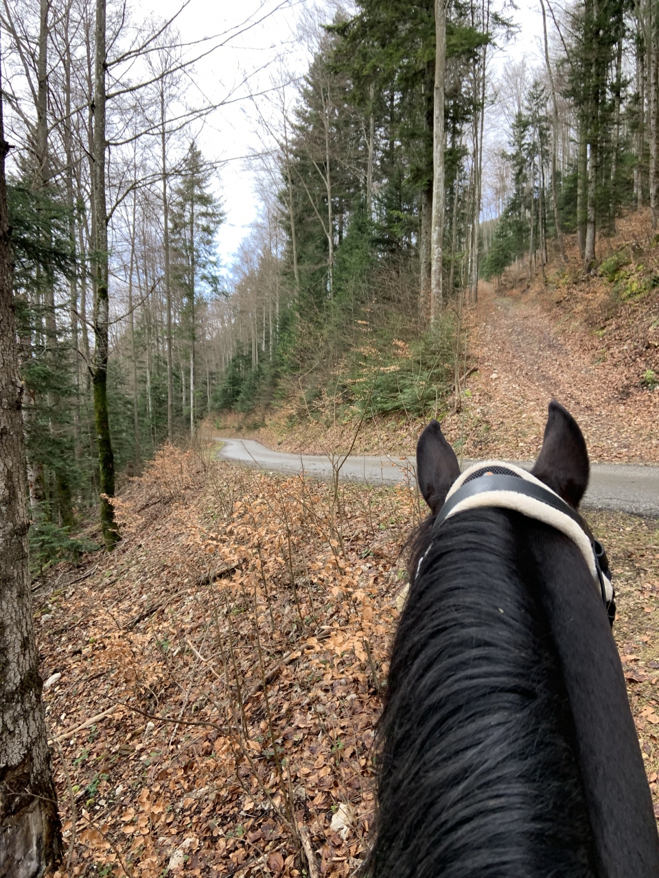 | Dire merci | Dernier bout de descente avant de sortir de la foret, là par contre ça se fait à pied.![]() C'est par là ? ![]() Il ne perd jamais le nord, miam le sapin ![]() Arrivés en bas, un arbre est tombé en travers du chemin, impossible de passer, on doit remonter un bout et faire un détour. On rejoint la route goudronnée qui rejoint la métairie sur la montagne. Elle est praticable à cheval mais il y a du trafic, c'est lourd. ![]() Vue sur le village où est située l'écurie. Au fond, ça mène aux Franches-Montagnes. Nous sommes aussi dans le berceau de la race, il y a pas mal de petits élevages dans le coin même si la majorité est produite pour la viande. ![]() |