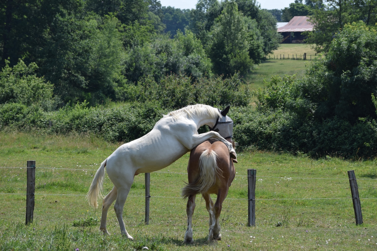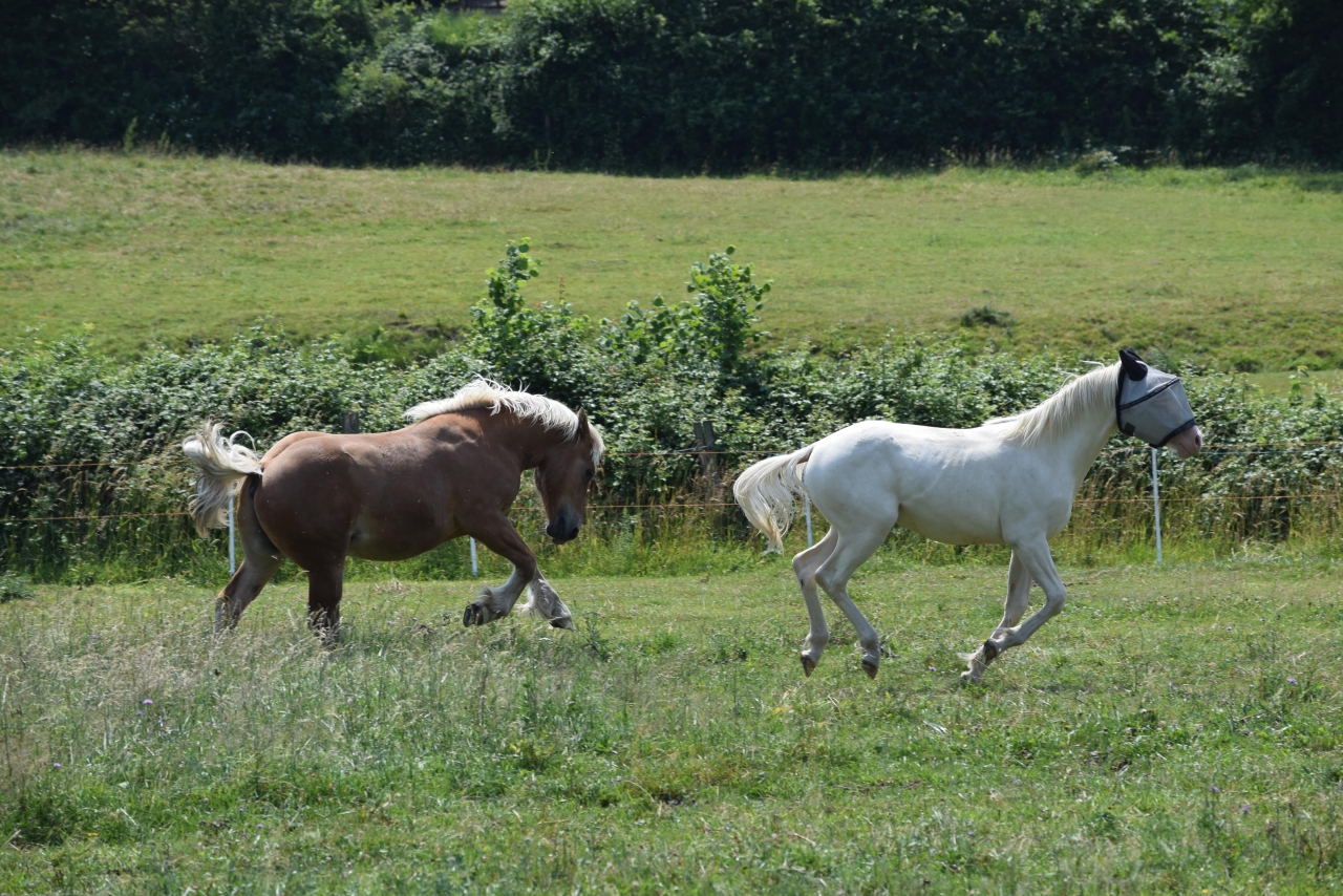 | Dire merci | Mon réflex est vivant ! Pour fêter ça, quelques nouvelles et pleins de photos des deux garçons ensemble, toutes fraîches de ce matin. Messidor est embêté par les suites de castration, ça s'est mal refermé. Il a eu 3 semaines d'antibios et de soins locaux. Il reste une croûte moche mais ma vétérinaire ne veut pas réintervenir pour le moment, on attend de voir si elle tombe toute seule. Vu que le traitement a bien fait effet, j'ai remis les deux gamins ensemble ! Photos toutes fraîches de ce matin (enfin fraîches non, il fait une chaleur abominable) Festival de jeux de poulain, sous le regard des vieux. Ya une haie à 2 mètres, mais non on reste à cuire en plein soleil... Tant que la reine mère a la tête à l'ombre ![]() Karaté-kid ![]() ![]() Messidor le lourdingue ![]() Ya comme une légère différence de modèle ![]() Sauf qu'au bout d'un moment, même les gentils placides commencent à en avoir ras la couenne ![]() |