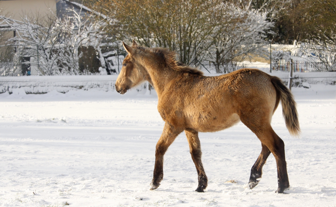 | Dire merci | merci 2021 : On commence l'année par le concours d'équifeel virtuel de l'association Caval'Go en catégorie poulain, avec des exercices de découverte : conduite en passant et s'arrêtant sur un bâche, conduite en changeant de main sur le trèfle, bouger hanches et épaules... On termine 4eme sur une trentaine ! En février nous avons une belle chute de neige (chose assez rare en bord de mer), Galelle nous fait de belles photos ! ![]() ![]() (8 mois et j'ai la quasi certitude que la bestiole ne sera pas petite !!) Le printemps et la mue arrivent, nos questions avec ! "elle est quoi, isabelle sooty ? elle va s'éclaircir ? rester foncer ? silver, pas silver ?" Et puis finalement elle s'éclaircit et garde le silver ![]() On passe l'été tranquille entre un bel abcès et un passage de la véto pour suturer une belle plaie au poitrail... On varie les sorties entre travail en carrière (passage de barres au sol, reculer, passer sur ou à côté de trucs variés -> elle s'en fout complètement, passer sous des trucs bizarres : elle aime moins), balades en main et liberté. On quitte petit à petit le physique de poulain ![]() ![]() ![]() Message édité le 10/07/23 à 13:31 Message édité le 10/07/23 à 13:32 Message édité le 10/07/23 à 14:31 |