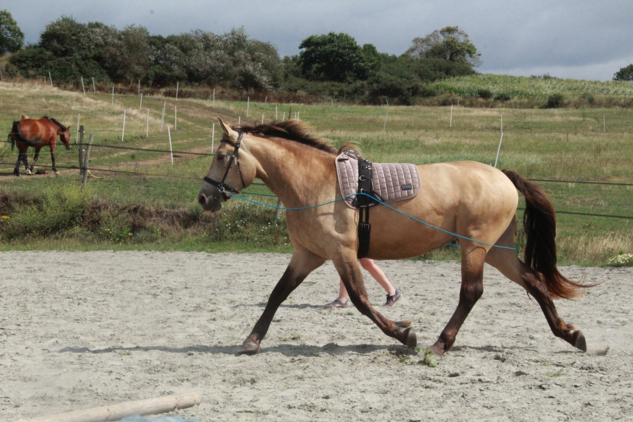 | Dire merci | Depuis quelques mois on a introduit tranquillement les longues rênes, on en est au cercle au pas et au trot avec transitions et quelques barres au sol. Une prochaine fois (quand il y aura moins de vent...), je passerai la rêne externe derrière les jarrets, la miss a tendance à se barrer sur l'extérieur à main droite. ![]() Super poulichette bien appliquée (et moi qui fait un peu du ski nautique de temps en temps ) |