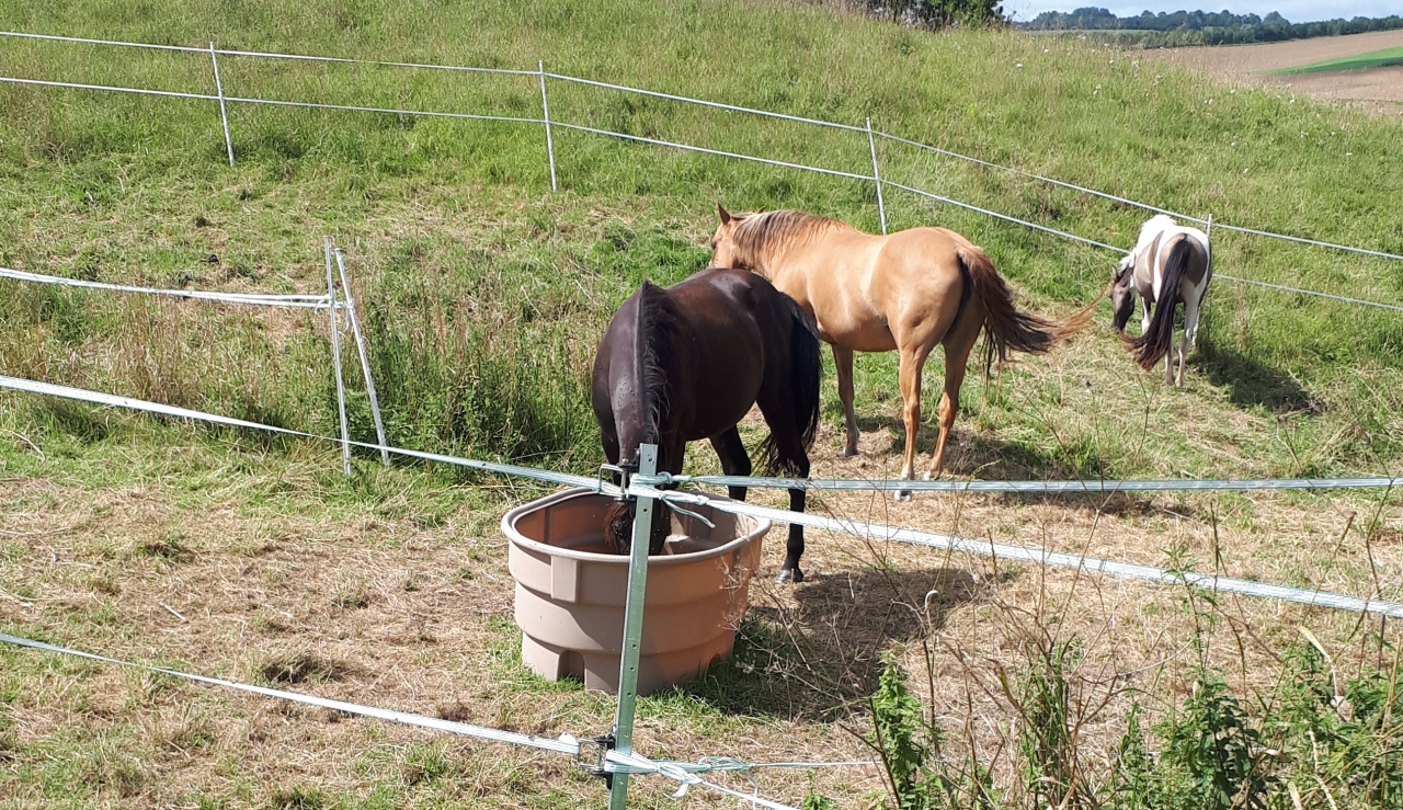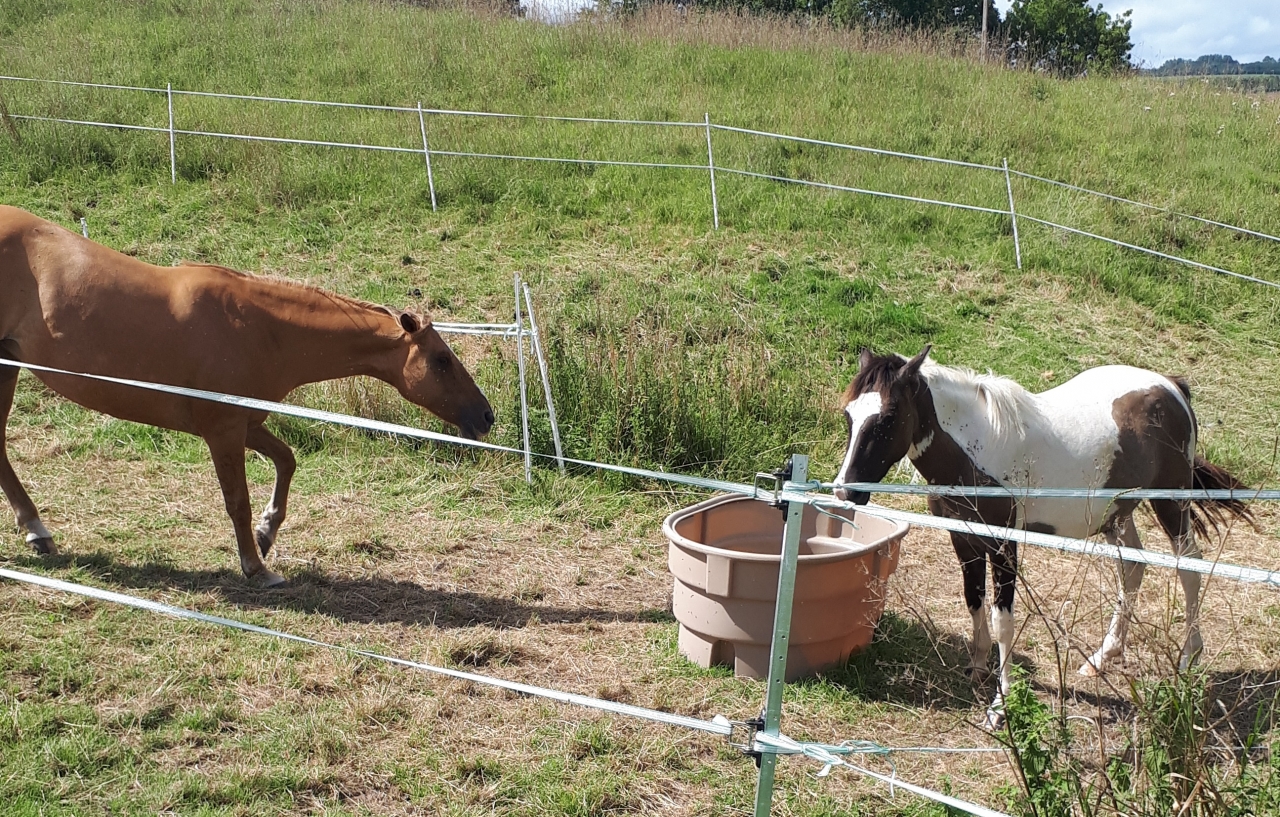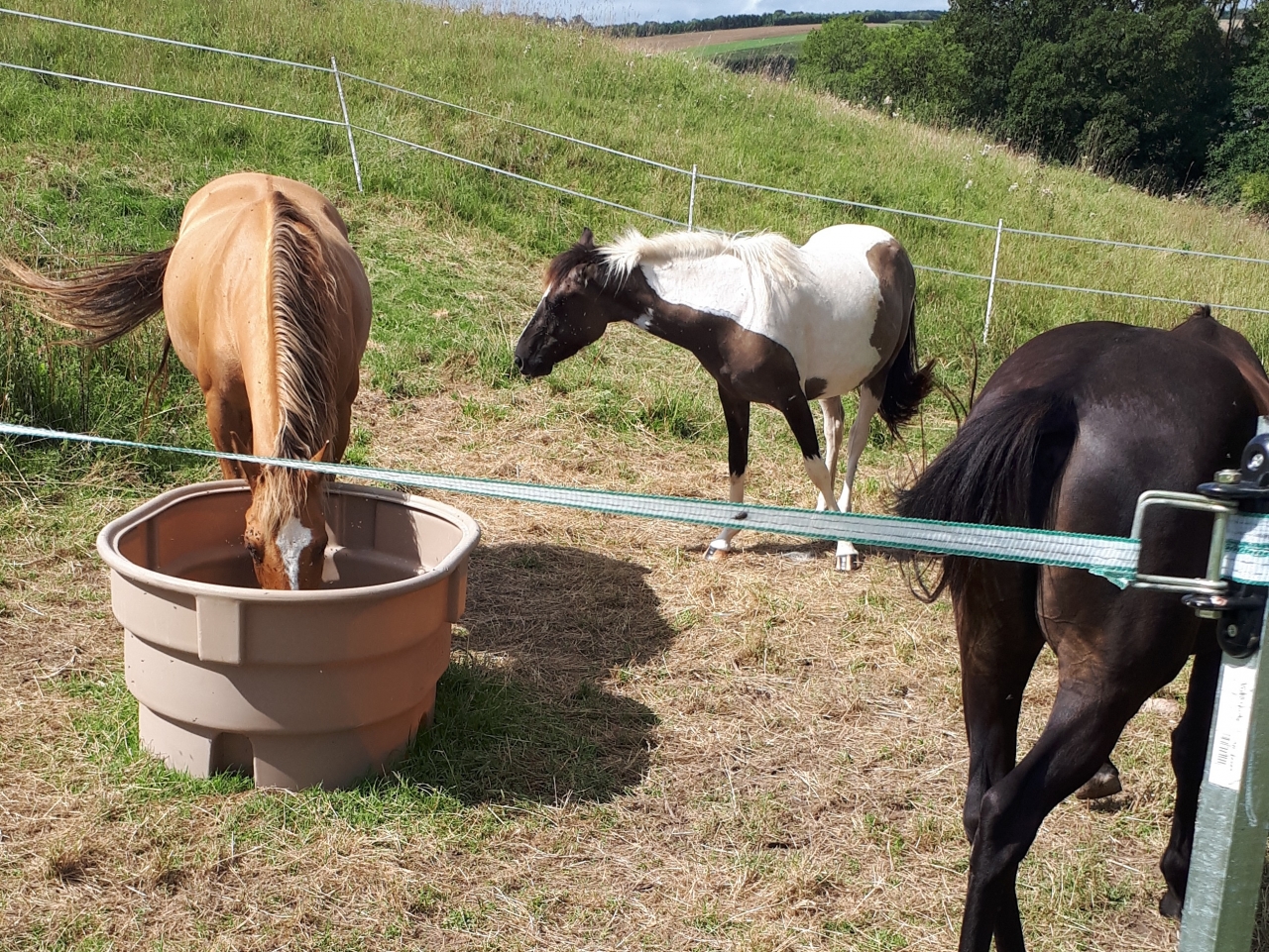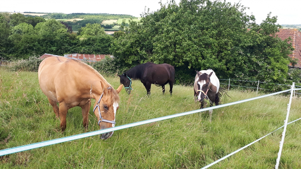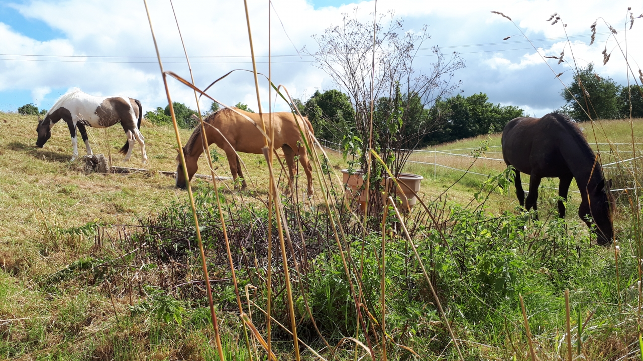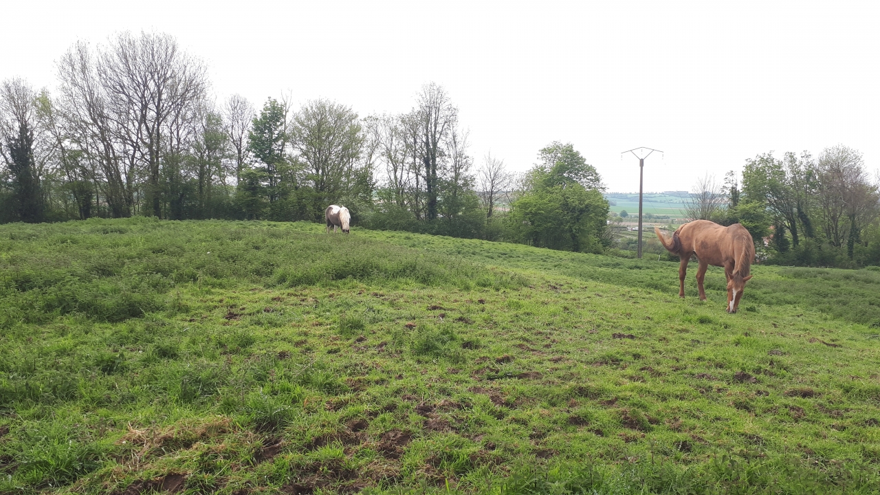 | Dire merci | maratre : J'ai 2.5 hectares de pâture. Au début il étaient dans un "petit" pré de 3000 m2, maintenant je leur ai ouvert une parcelle de 1ha autour de ce pré, et il reste encore une autre parcelle de 1ha. Celle-là, je dois encore la sécuriser, parce que le terrain est bordé de barbelés, et avec la petite qui va mettre son pif de partout je sécurise bien toutes les zones où les barbelés ne sont pas complètement recouverts de ronces. erzebeth : c'est Love (la petite), Draco (le hongre) et Kiara (la jument adulte) |
