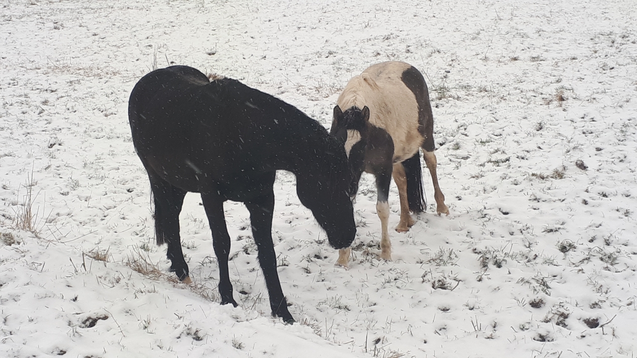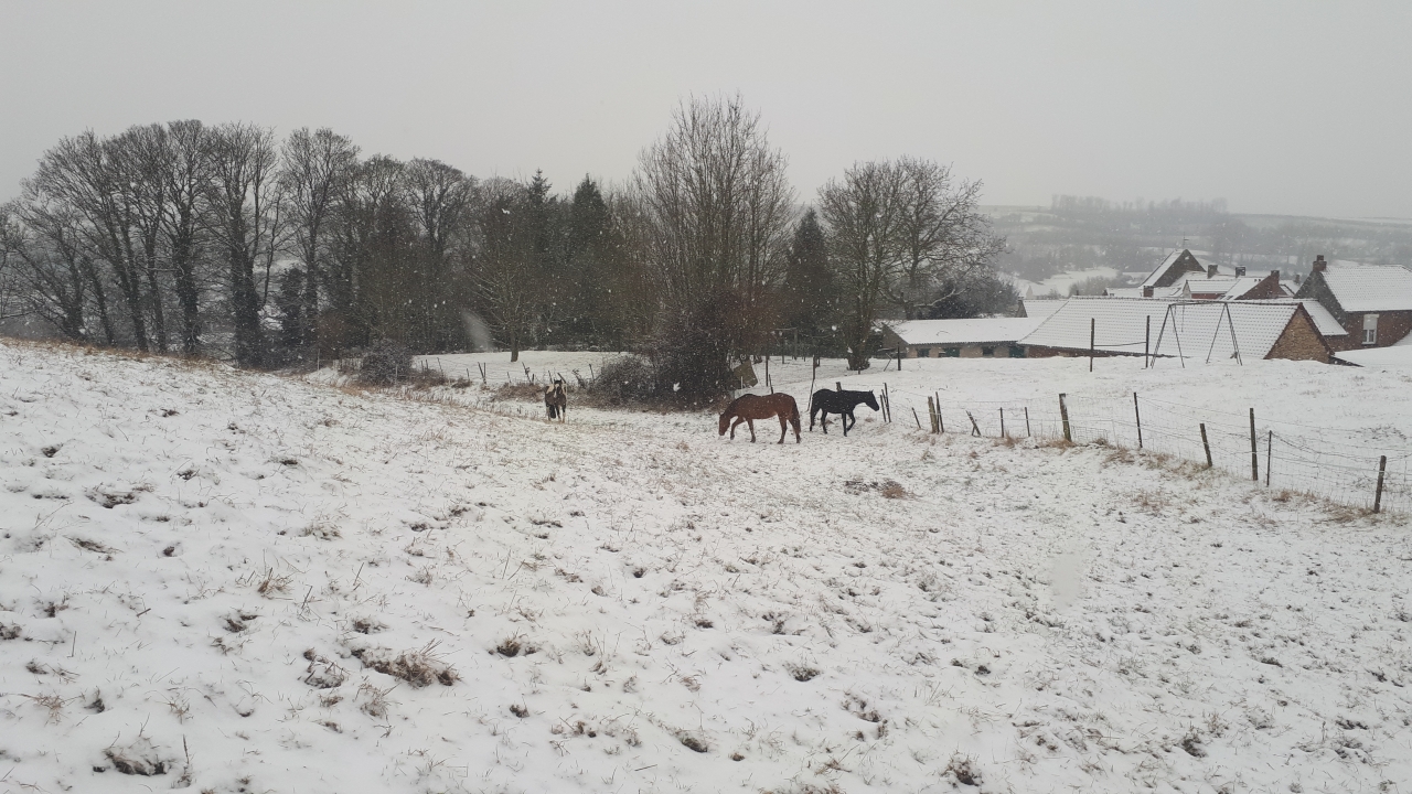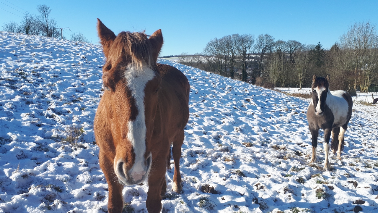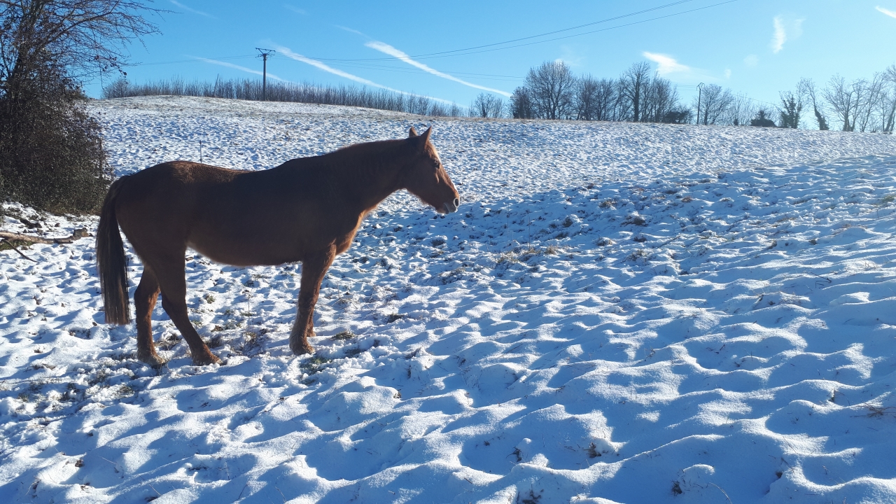 | Dire merci | Je profite de mettre des nouvelles, c'est la première fois depuis que j'habite dans le Pas-de-Calais qu'on a de la neige qui tient plus d'une demi-journée, c'est chouette ![]() ![]() Love se faisant lâchement abandonner par les deux autres pendant sa sieste ![]() Elle devient vraiment mignonne la minus ![]() Kiara est fidèle à elle-même, mignonne mais pas trop quand même, ça reste une jument donc il y a un quota d'oreilles couchées quotidiennes à respecter Mais en vrai je la trouve hyper calme et apaisée, ça me fait plaisir à voir. ![]() Quant à Draco, je vais devoir lui faire un check-up véto. Je le soupçonne d'avoir des ulcères, il baille très souvent et il doit avoir un souci à un œil qui pleure souvent. Je soupçonne tout ça depuis que je l'ai acheté, mais comme il n'y avait pas d'urgence vitale, j'ai voulu attendre qu'une relation de confiance s'installe un peu. Parce qu'au début, il était impossible de toucher sa tête en liberté et si je l'approchais avec une brosse en liberté, au mieux il fuyait, au pire il essayait de me latter. Pour moi il était inenvisageable de faire des soins potentiellement "chiants" dans ces conditions, mais là je trouve qu'il s'est beaucoup apaisé dans sa relation à moi. Il commence même à vouloir faire des gratouilles en retour. Bon ça ne l'a pas empêché de me latter la cuisse hier, il était enragé et m'a confondu avec Love qui traînait à côté de moi pendant que je faisais les fumiers. Il s'est pris une soufflante (on-ne-latte-personne-quand-l'humain-est-là), mais en vrai il a dû se rendre compte très vite de sa méprise parce qu'il a amorti à fond le coup, j'ai juste "senti" un sabot qui se posait sur ma cuisse (j'ai rien vu, c'était de nuit et j'étais avec ma frontale qui rend l'âme ), mais aucune douleur ni aucun bleu.Mais il est quand même attachant le bougre ![]() (on notera qu'un cheval noir dans la neige, c'est pas ouf à photographier )![]() |