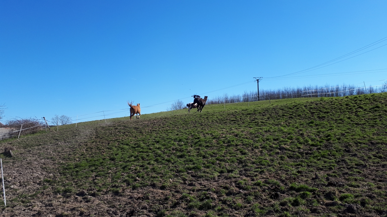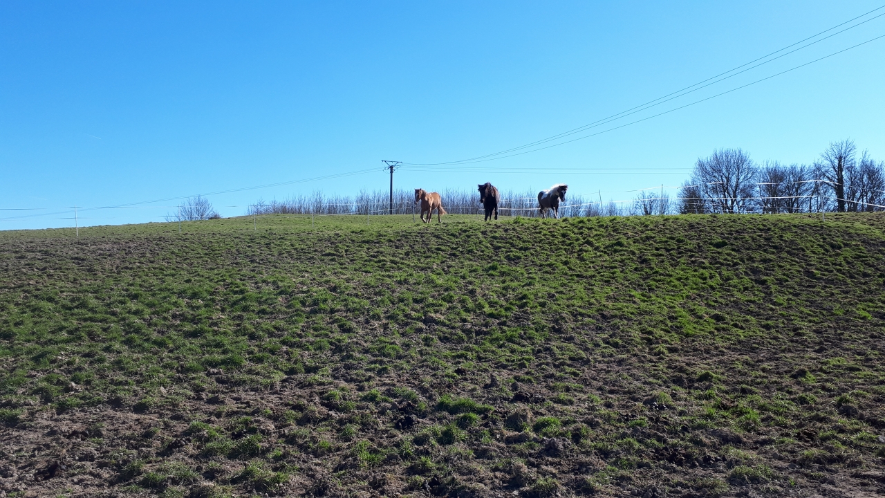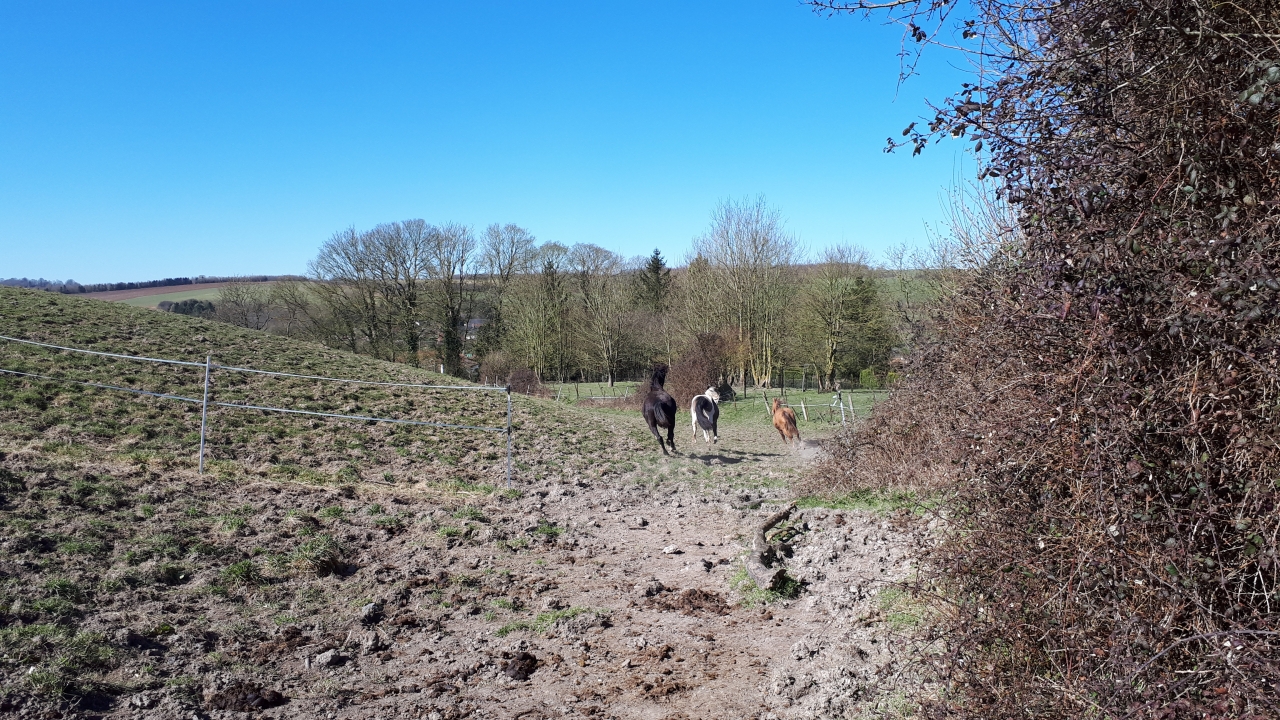 | Dire merci | Oulà, ça faisait longtemps que je n'avais plus rien posté ! Bon ça fait des mois que je me coltine une tendinite à la main droite qui m'empêche de mettre de la force sur une longe, alors mes chevaux sont en jachère... J'avais fait des sorties dans le village avec Draco et avec Love, je suis un peu dégoûtée de ne plus rien faire... J'ai fait un test avec Kiara en la prenant à la main gauche, mais je n'ai pas les bons réflexes avec cette main, donc je préfère ne pas faire n'importe quoi avec mes apprentis... Les seules sorties sont donc du brout-brout derrière la maison ![]() Mais ils ne sont pas malheureux, aujourd'hui ouverture de parcelle et vent froid qui pique, ils étaient contents ![]() ![]() ![]() Ça muscle ![]() ![]() |