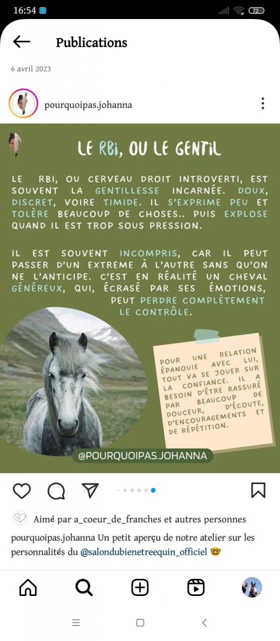 | Dire merci | Des ptites nouvelles ici, après un mois de vie commune. ![]() J'étais en formation pendant 3 semaines donc pas facile d'y aller régulièrement. Mais en tout cas, la marche en longe est bien acquise. Elle répond très bien à la voix et à la pression, elle bouge les hanches, les épaules... Mais toujours dans la pâture On y était presque, mais un âne maléfique a fait son apparition, et là c'est le drame ![]() J'en rigole ...jaune parce qu'elle en a vraiment vraiment peur. Ça fait deux jours qu'on y travaille. Mais fiouuu pas facile! Surtout que cet âne est autour de l'écurie active en liberté donc il peut se trouver à n'importe quel endroit et surgir de nul part le saligaud ![]() Et je ne sais pas si vous connaissez le test pour savoir si votre cheval est plutôt cerveau droit ou gauche, introverti ou extraverti. Je me suis dit que c'était rigolo de le faire et je trouve que ça correspond totalement à sa personnalité. Du coup je l'ai fait aussi pour léo et ça correspond aussi parfaitement bien! ![]() |
