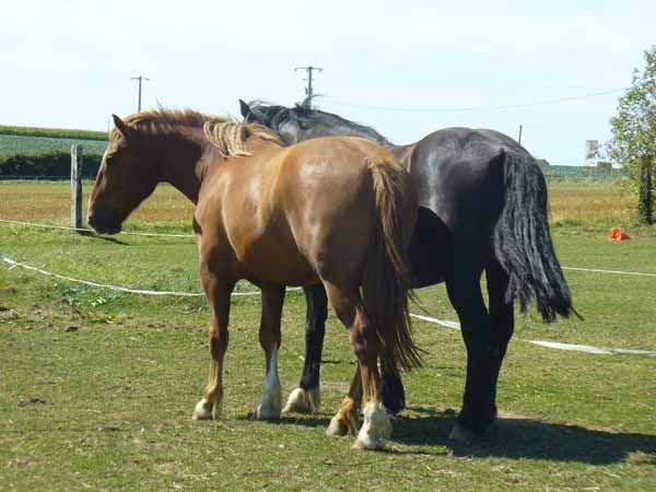 | Dire merci | ils ont de Saint malo il me semble. Là quand ils ont lâché les 2, y en a un (certainement plus jeune car encore un peu gris, mais bon ceci dit je m'y connais en robe de percheron) qui a commencé par être joyeux et faire le foufou, je me suis dit que non décidément même avec une barrière en bois, si il voulais sortir il le pourrait surement, et encore je parle même pas du coin où il y avais que des ganivelles. Donc finalement on va peut être plutôt proposer ce plan à Mendoline avec mumu et mandarine c'est moins dangereux |