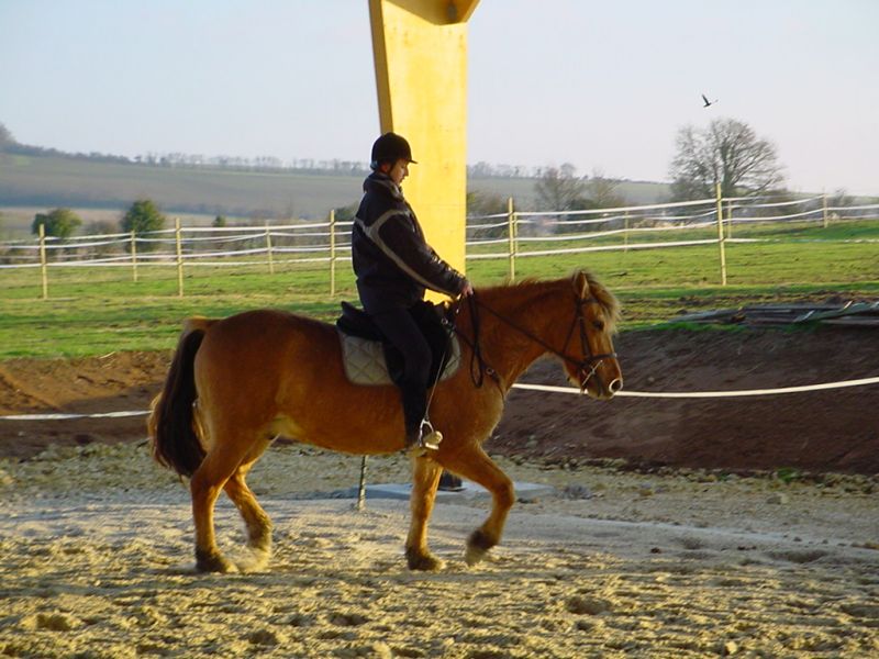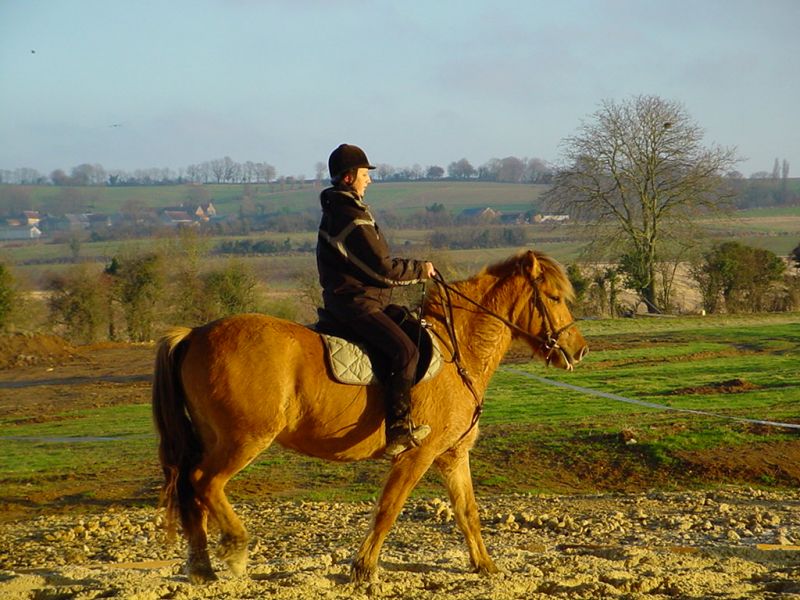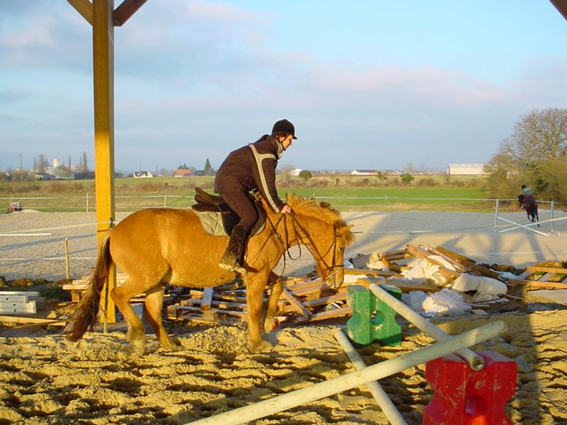 | Dire merci | Donc ![]() J'avais pas vu pilou depuis 1 semaine...il me manquait...et je trouve un truc crado et exité comme une puce...il a commencé par une baffe car il me prenait pour un arbre il bougait au sanglage...sur la route avait peur de tout et m'a fait son PREMIER écart (mini) a planté a un endroit...a tenté de m'enmener dans un chemin...bref TRES PENIBLE j'avais jamais eu pilou comme ça ![]() Donc on arrive au club...en selle et on va dans le manège...but du jour toujours le moteur...on travail les transitions montantes et déscendantes toujours dans l'optique : pressions des mollets...si pas de réponse coups de talons...si pas de réponse cravache...j'ai du mal à avoir le réflex donc ça le fait pilou avance mieux...et s'arrête mieux...car il a tendance à s'appuyer devant et s'arrêter 8m plus loin...Donc on passe au galop pour qu'il apprenne...et là bof...pilou n'est pas à l'aise à droite...et SURTOUT JE ne suis pas à l'aise...quand pilou me fait des conneries c'est au galop...et j'ai peur de finir par terre à gauche ça va mieux on arrive à faire un cercle complet et il part mieux...Donc je m'y esseye un peut...et puis tedi me le prend...et là je vois mon petit poon's TROP beau qui galoppe bien et tient le galop (bon en tentant de ralentir l'air de rien près de la sortie mais la cravache est là ) ...il était trop beau mon bébé et tedi lui a même fait faire quelques déplacements de hanches *** |