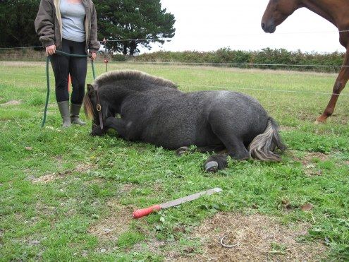 | Dire merci | Et méfiez vous, ça c'est le résultat après l'attaque de la méchante maréchale qui l'a obligé à se coucher. Vous voyez pas son regard de martyre? => C'est un poney de combat, il est trop fort !Comme il s'appuyait sur moi je me suis dit que je n'avais qu'à le laisser se casser la gueule et qu'il se sentirait tout con après (comme un cheval normal quoi !)... Mais non, une fois à terre, il s'est baffré d'herbe et n'a pas cherché pas à se relever... ![]() Une fois le parage fini, je l'ai fait se coucher une seconde fois sans problème, puis une 3ème pour la photo, mais comme il maîtrisait parfaitement la prise de catch, et qu'il était tellement pressé de se coucher, on s'est étalés par terre en même temps |