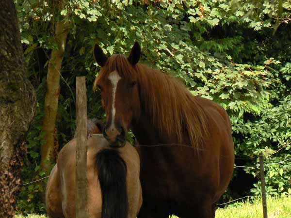 | Dire merci | Je suis à 50 km au sud de Créhen. J'ai de jolis chemins de balade à 10 minutes de la maison mais pas de cheval montable... Cela dit, si tu veux venir faire un tour, tu es la bienvenue. Mendo, hé ben, qu'est-ce que tu lui as fait à c'te pauvre porte ? |