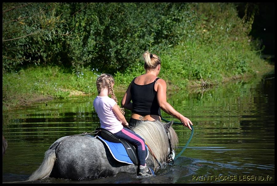 | Dire merci | Merci les filles, c'est vrai qu'il est craquant même si oui, il a zappé les tâches. Mais il compense avec sa gentillesse, une morpho qui promet et une tonne de crins Et sinon, ben ici, on crève toujours de chaud donc hier, direction la rivière avec Kened, Végas (monté par la fille de l'éleveur), un vélo et le papa de Dark. Ben ça fait un bien fou. D'autant que Végas a un succès fou et en plus de servir de monture de ballade à la petite de l'éleveur, il va peut être avoir une vraie dp (enfin s'il lui fait pas trop peur avec ses jeux) ![]() ![]() ![]() |