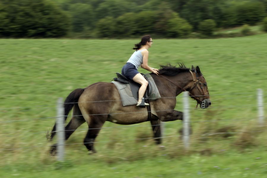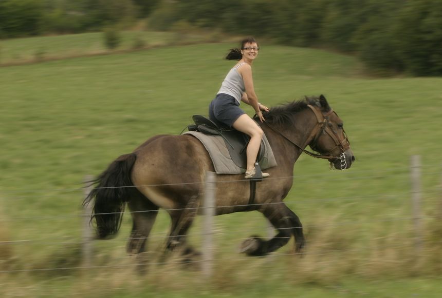| Dire merci | KERSO : Merci pour ces photos elles sont superbes ! J'adore celle où tu es avec ton fiston, vous êtes trop beaux tous les 2 Quand aux photos du galop, ben elles sont extra, et ton sourire n'a d'égal que le mien !On refait ça quand vous voulez, les chevaux n'attendent que ça! laurebrrrr : Ben encore heureux, si on tire la gueule quand on monte à cheval, autant se mettre au tricot ! M'enfin au moins tu peux voir ce que j'entend par attitude "haute" pour le Quéké dès qu'on passe à autre chose que du pas ! D'ailleurs, je t'invite à commenter ici ou par mail, comme d'hab quoi ! Quand à ma position ben hum... la photo parle d'elle même avec mes talons qui remontent, et moi qui me tient n'importe comment... enfin pour ma défense ma préoccupation principale au galop à ce moment là, c'était de pas me retrouver les seins à l'air à cause de mon haut qui se faisait la malle, d'où la tenue des rènes à une main, l'autre pour cacher la misère aline : les mêmes de toi avec Quiété... tu sais ce qu'il te reste à faire ? ![]() Stephy : Ben oui, le Pak qui dépote, puis il a trainé sur le départ, et le Quéké trace devant du coup il met la gomme pour ne pas se faire semer ![]() |