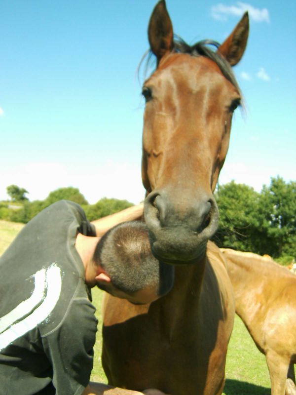 | Dire merci | Pancho a 4 ans je l'ai débourré a 3ans et je l'ai acheter ensuite ... histoire un peu compliqué donc je fais simple ! maintenant ça fait depuis le mois de janvier qu'il est chez moi avec mon autre jument de 11 ans et la jument de ma soeur qui a 14 ans ! il est génial : je pars en ballade seule, je fais un peu de trec, travail en main, en liberté, il saute bien et dresse bien aussi ! il est Trotteur par le pere ! sa mere est un jument pie isabelle que je dois voir surment cet été ! Quand je l'ai connu il n'était ni manipulé ni castré ! on l'a fait castré et ensuite j'ai commencer le travail en main ! c'est un cheval qui était sur la défensive sans etre méchant ! maintenant c'est un amour je fais tout ce que je veux avec il est content tout le temps ! quand j'arrive il vient me voir et me lache plus ! c'est un super cheval et je ne regrette pas de l'avoir acheter ! voila pour l'histoire de mon Loulou qui me remplit le coeur d'amour |