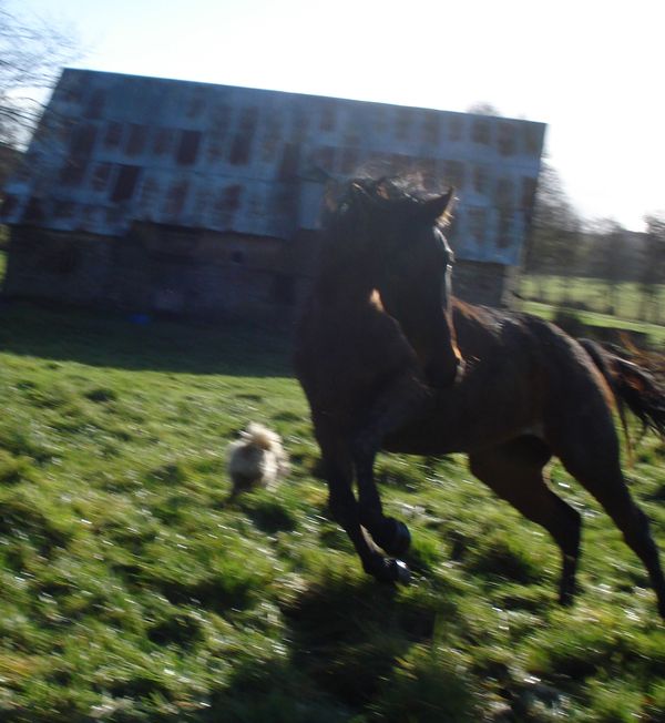 | Dire merci | MDR bah ca m'empeche pas d'aller l'embeter dans son pré bon cet aprem je vais essayer de monter avec une corde mdr!!!!! et moi j'ai meme pas de chiens ![]() alors c'est moi qui fait les photos, du coup je suis jamais entierement dessus mdr!!!(sisi, la c'est mon doigt que vous voyez MDRR) |