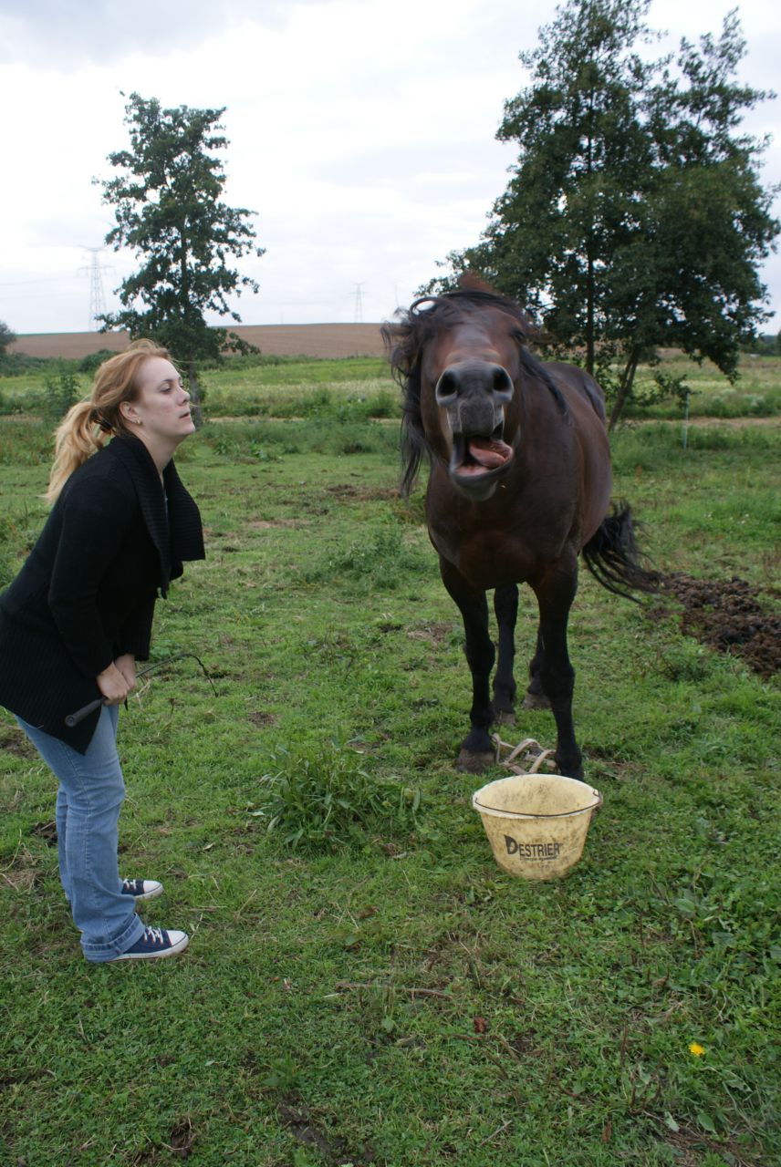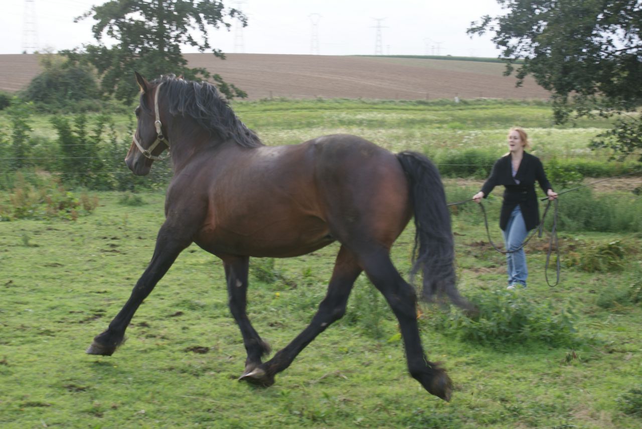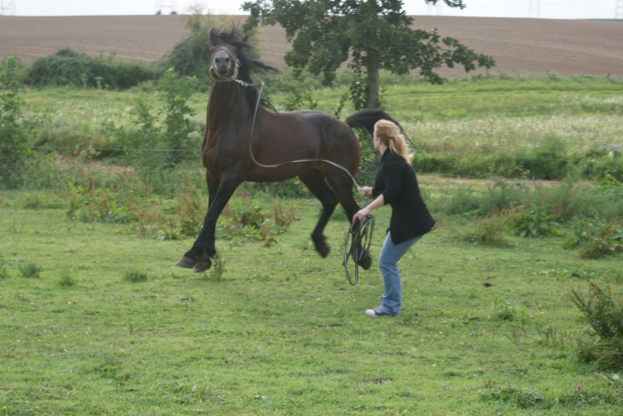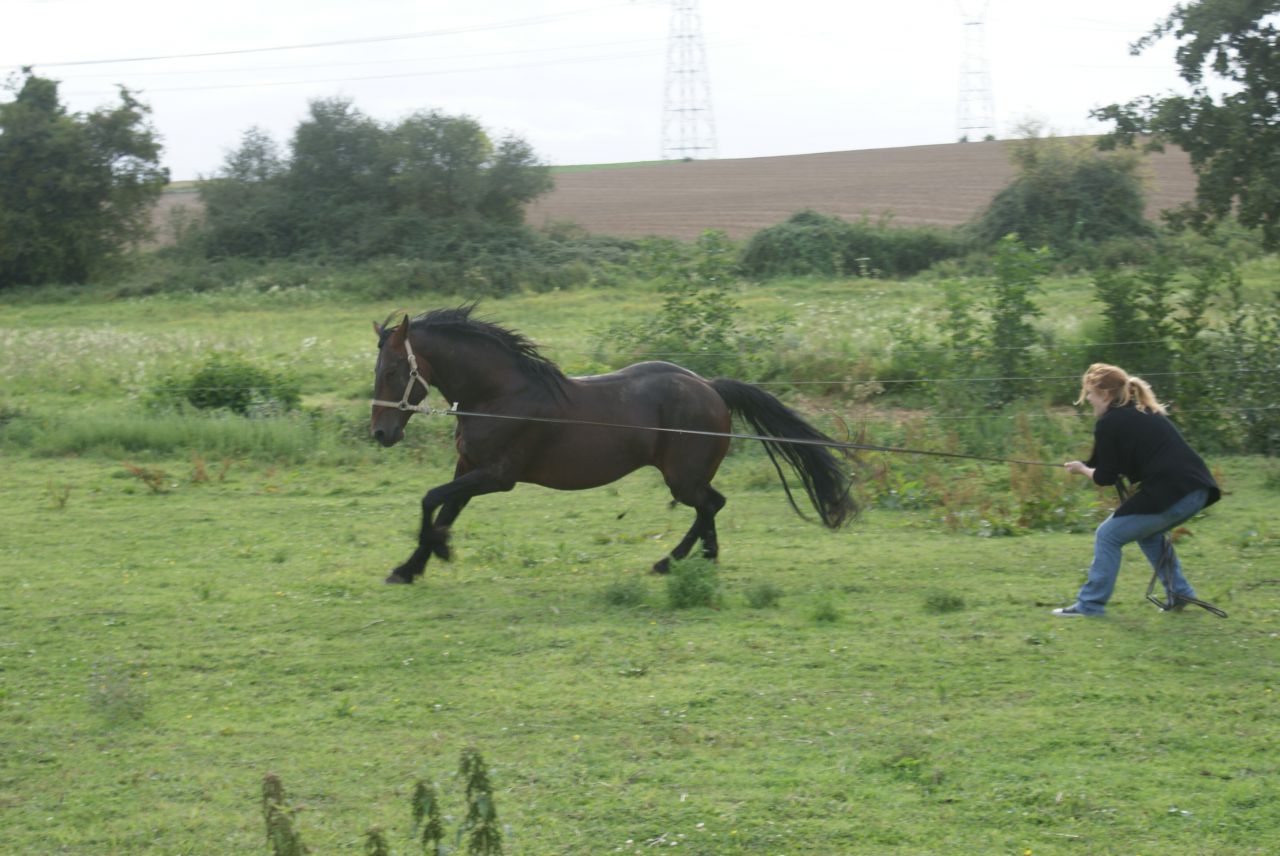 | Dire merci | à la longe, il faisait le terrible et bien sur, j'ai pris mon petit caveçon car le filet etait dans l'huile, resultat caveçon trop petit donc j'ai été obligé de le longer au licol (ça etait du sport) au pas: ![]() et hop, au bout de 5min, ça a dégénéré ![]() mais j'ai pas laché!!! ![]() la tension est un peu redesencu, et on passe tranquillou au trot: ![]() puis on le longe de l'autre coté: ![]() tite papouille de recompense ![]() ![]() |