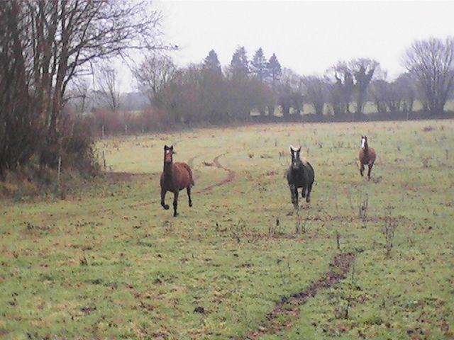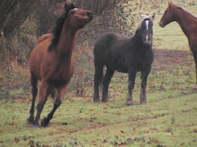 | Dire merci | J'ai une dizaine de photos sympas de ce matin : les chevaux sont lachés dans le grand champ, ils étaient contents!! Début, des opérations : Tayoooooooooooo!!! ![]() Ruby est à fond, une rafale sur elle : ![]() ![]() ![]() ![]() Au retour, on frime, on fait l'arabe : ![]() Westhani ronfle, il en voudrait plus!! ![]() Alors, il pousse Ruby : ![]() Mais Ruby n'a pas que ca à faire, car elle est aussi surveillante de vache, alors elle s'attèle à la tache, cachée derrière les buissons, elle espionne les vaches du champ voisin : ![]() Ils se sont bien éclatés aujourd'hui, ils avaient besoin de se défouler dans le grand champ, on nottera la petite forme de Physicien qui n'a fait que suivre....Il en faut toujours un pour calmer le jeu, c'est toujours soit Westh soit Physicien qui met le basard et l'autre qui calme le jeu... |