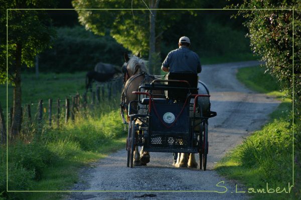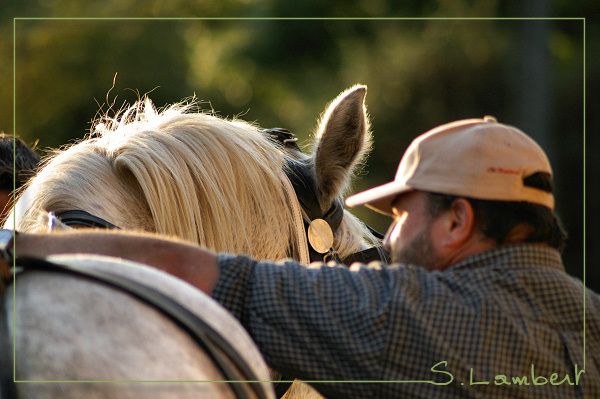 | Dire merci | ...suite Deuxième mise à la voiture, hier. Comme Polka a été sage avant-hier, nous enchainons donc à l'étape suivante : attelage en pair. Préparatifs ![]() On équipe... ah oui Polka, ce harnais là, pèse un peu plus lourds que le synthétique d'hier... ![]() Détente en longe ![]() ![]() Queluz surveille du coin de l'oeil ![]() ![]() C'est l'heure de la mise à la voiture... ![]() Départ tranquille au pas avec le groom à pied devant pour rassurer. ![]() Tout le monde est à l'écoute, et tout se passe merveilleusement bien. ![]() Pas question pour moi de monter dans l'attelage bien évidemment... j'ai donc laissé nos compères partir sur le chemin et faire pour cette première, le tour du village. Une dizaine de minutes plus tard, j'entends les sabots sur le goudron... et ça y'est les voici qui apparaissent à l'horizon ![]() ![]() Séance positive, grosse récompense, on dételle. ![]() ![]() ![]() ![]() C'est tout pour aujourd'hui ! Polka va maintenant cogiter sur ce qu'elle a appris durant une dizaine de jours, et elle sera réattelée en paire ensuite régulièrement, tout en alternant séances montées, longues renes ou longe. |