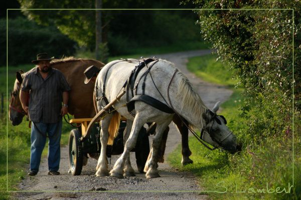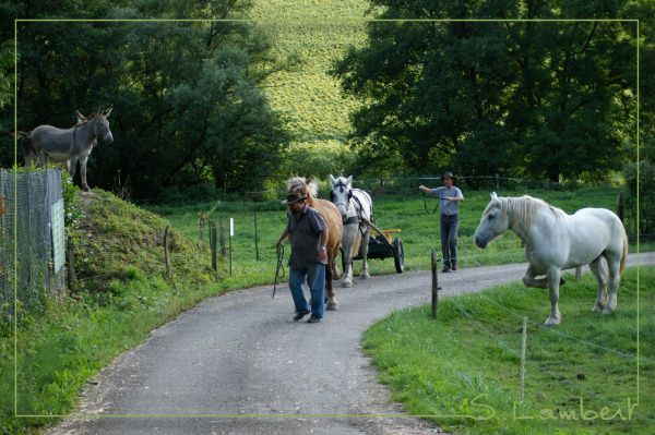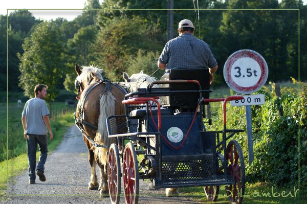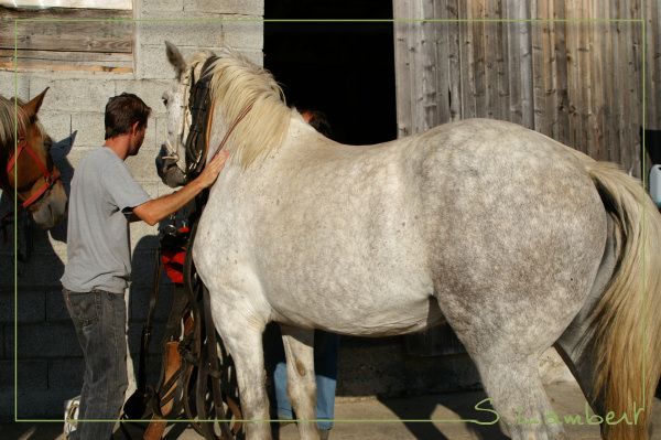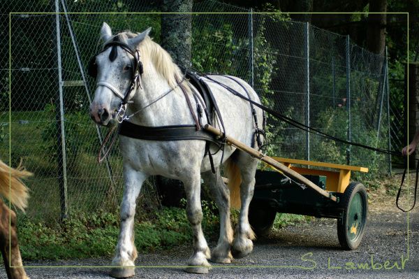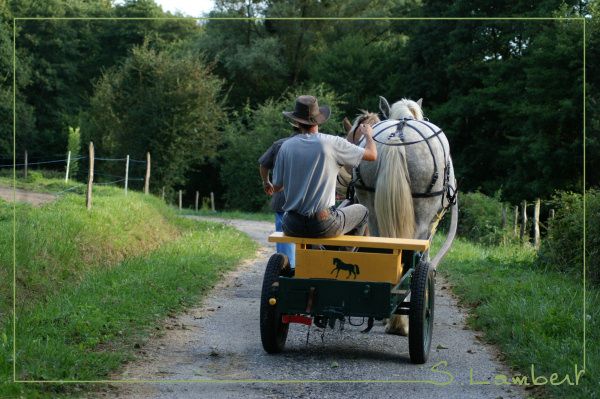 | Dire merci | Je ne peux plus monter à cheval pour le moment... mais je peux encore prendre des photos quelques clichés d'hier et avant-hier... débourrage à l'attelage, 1ère et 2ème mise à la voiture de Polka, une PP shire de 5 ans. On attelle... ![]() Et c'est parti au pas tranquille ![]() Sous l'oeil avisé et curieux d'un des poneys du frère de Groslulu en vacances à la maison. ![]() Tout se passe bien, Polka est calme et décontractée, et suit Jacob tranquillement ![]() ![]() Tandis que Manon braie à tue-tête que sa copine part ![]() Comme tout va bien, on passe à l'étape suivante. Alban prend les guides et mène l'attelage à pied de côté. Jacob est toujours devant. ![]() Jacob prend un peu de distance devant, Polka est toujours sereine et à l'écoute ![]() Demi-tour en main, au milieu des voisins équidés qui pour l'occasion se sont approchés (ânes à gauche, percheron à droite) ![]() ![]() La route monte légèrement, il faut tirer un peu... ![]() Comme tout se déroule toujours bien, on passe à l'étape suivante : Alban monte dans la débourreuse. ![]() Puis il est temps que Polka passe devant Jacob. ![]() Réparation de la ficelle de botte qui a laché - afin de pouvoir céder rapidement en cas de problèmes, les traits tiennent au palonnier au moyen d'une ficelle de botte... qui là a cassé toute seule :lance-pierre: Voyez le stress indubitable de la jument... ![]() ![]() Retour à la maison, on dételle et on félicite ! ![]() ....suite |