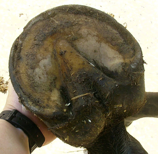 | Dire merci | Je sais pas si vous vous rendez compte. On voit bien l'épaisseur de paroie sur les dernières photos. Elles ont bien pris un cm d'épaisseur en un an. Elles étaient quasi inexistantes quand j'avais récupéré Neyrac. Et si vous regardez aussi l'antérieur gauche, vous pourrez voir que la forme de pied s'améliore et qu'il part moins en hauteur, signe qu'il reporte su poids sur ce pied. Donc ca évolue doucement. Le pareur me dit que son pied évolue encore que peut être il faudra encore un an pour qu'ils soient bien. Donc il y a encore de l'espoir que ça continue à évoluer. On laisse la paroie dépasser un peu de la sole ( surtout sur le pied plat) pour protéger les pressions sur les fourchettes qu'on ne peut pas plus tailler. |