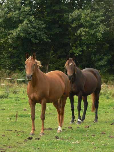 | Dire merci | Petite chronique de Lannigou, pour mettre un peu de couleur dans le poste de Bellinda. L'autre semaine à mon arrivée à Lannigou les 2 miss tranquilles au cassecroute. Du côté des mamies, c'est la grande inquiétude, il doit se passer quelque chose dans la forêt ! Les carantec sortent à leurs tours du potager et fixent le même point, puis au tour des 2 jeunes. Je rejoints fissa la pâture de Belline et de Ode, non tout est calme par contre du côté des poulinières c'est galop, galop et galop. J'imagine la discussion entre Belline et Ode : " on ne peux même plus déjeuner tranquilles ! " |