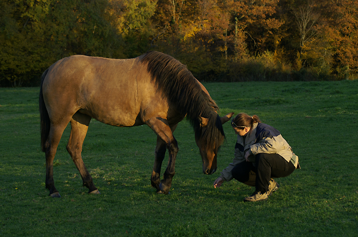| Dire merci | Querida (du Baron) est une jeune Pur Sang Lusitanien qui prendra 4 ans le 8 avril prochain très exactement. Achetée à 6 mois, mais récupérée qu'à 1 an (pour cause de météo, sans poil d'hiver je n'ai pas voulu la laisser dans les nuits froides de la dombes, j'ai donc préféré qu'elle reste chez l'éleveur où elle était rentré le soir). Elle est débourrée à la monte depuis peu, et pour le moment nous alternons séances papouilles, pansage, liberté et balades à raison de 3 à 4 fois par mois. Je ne suis pas pressée, Mlle est relativement tardive... déjà plus grande que ses parents, elle continue sa croissance tranquillement, alors je la laisse grandir. D'ailleurs on voit bien qu'elle n'ait pas finie, elle a toujours une bouille de bébé Papa et maman Voilà papa : ![]() voilà maman et ma soeur RAJADA ![]() Petite rétrospective en photos Quelques semaines... ![]() 4 mois... ![]() quelques mois plus tard... ![]() un an.... 1ère douche ![]() un an 1/2 grooosse poussée de croissance ! ![]() |