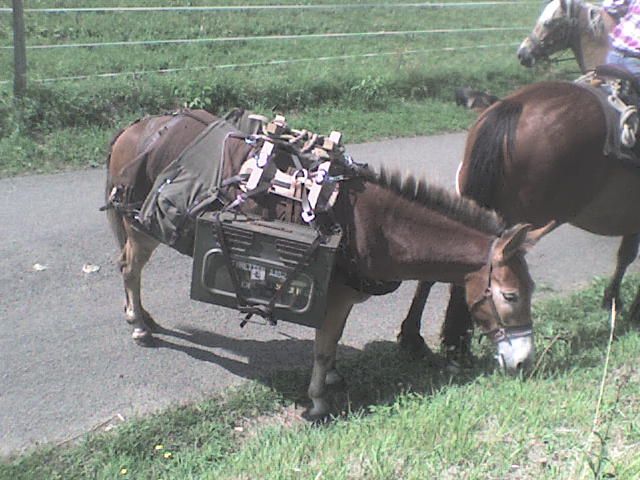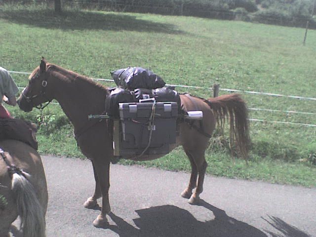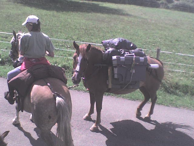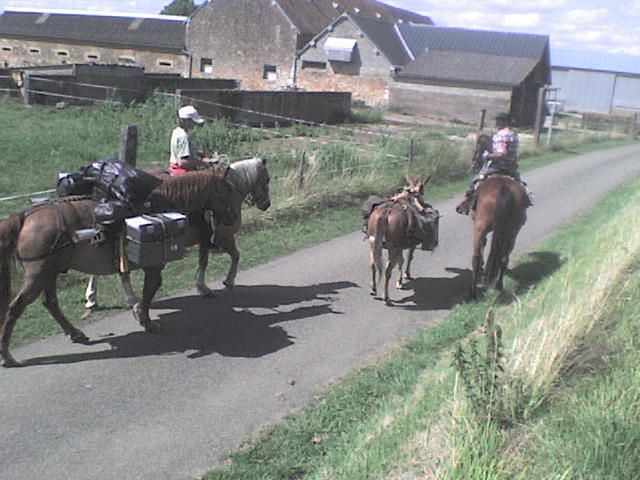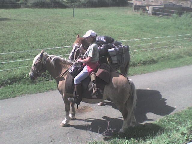 | Dire merci | Hier, chez moi est passé un couple de randonneurs... ils sont partis de Cée dans l'orne et rejoingnent Compostelle en Espagne (ça c'est de la randonnée). une homme, une femme, un troteur, un haflinger, une mule, un anglo (selon eux) 2 chiens. a priori tres peu d'experience de la rando, savent tout juste monter a cheval. (selon leur dire...) quelques photos (prise avec mon telephone alors pas terrible, mais ça donne une idée..) La randoneuse ![]() Le randonneur ![]() ![]() La mule ![]() L'anglo batté ![]() ![]() L'ensemble ![]() L'ensemble avec les mins qui suivent.. ![]() |