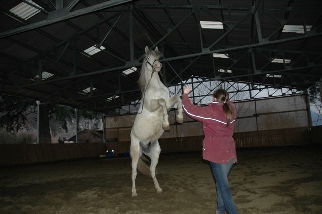 | Dire merci | Dis Emeline, je rêve où tu te moque? Vilaine, va! Juste pour taire les rumeurs de danse des canards, quand je m'accroupie, c'est le signal pour "tu stope tout et tu viens me voir". Ben quoi... Et oui quand je marche et que Espé ne garde pas ses distances, j'agites les bras pour le fire reculer... mouais, pas très esthétique tout ça! Merci pour les photos, Electra! Mais Espé il posait vraiment pendant que je le désensibilisais au stick, j'hallucine! il en avait rien à faire! Il y a du progrès, moi je vous le dis! ![]() |
