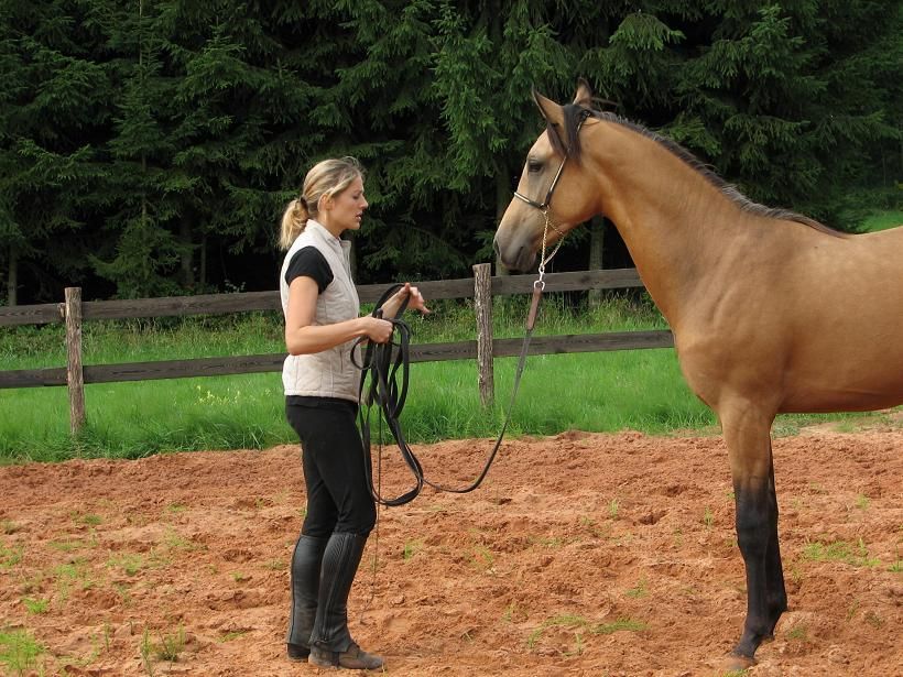 | Dire merci | Vous etes plusieurs a me demander des nouvelles depuis mes maccabres mesaventures avec mon defunt petit Tequiero.. Alors voilou, un post specialement pour mon p'tit bout, celui qui a su me remettre sur les rails, me redonner gout a l'éducation d'un poulinou, qui egaye mon quotidien, et qui s'avère etre tout a fait a la hauteur comme relève de mon Titi pré retraité (irremplacable bien entendu )Alors le voici tout petiot, crins au vent, au fin fond de l'ardèche ![]() ![]() Et déjà bien vigoureux, et chiant pour ses copains de pres... Mais c'est ce que j'adore chez lui ![]() Puis le voici a son arrivée, fin janvier, à 7mois, un beau petit Kdo d'anniversaire!! Bien velu, un peu sauvageon, timide, craintif, mefiant,peureux, terrorisé.. Il m'a vraiment fait de la peine.. Il est tellement attendrissant avec ses grands yeux de cocker... ![]() ![]() ![]() Voyant son temperement, je me voyais debordée de boulot, de seances de desensibisations, et de decouvertes du monde! Mais apres deux mois de boulots, a compter de deux seances de 5 a 10 min par semaines, voilà le petit bout metamorphosé! Il commence doucement a ressemblé a un cheval, et non plus a un lama :-) Et sa robe se revele superbe, bien doré comme je l'avais commandé ![]() Courageux, il monte dans le van comme un vieux cheval rodé de concour! ![]() Et marche aussi sur des baches horribles, gonflées et bien bruyantes! ![]() ![]() Et se laisse brosser ss meme etre attaché! Il a enfin compris qu on ne le frapperait pas coup de gourdin! ![]() ![]() ![]() Tres vite distrait et peu attentif, il semble être tres doué en dressage Bon, il n'a que 11mois, donc on va trop lui en demandé qd mm.. Mais le voici déjà en épaule en dedans ![]() |