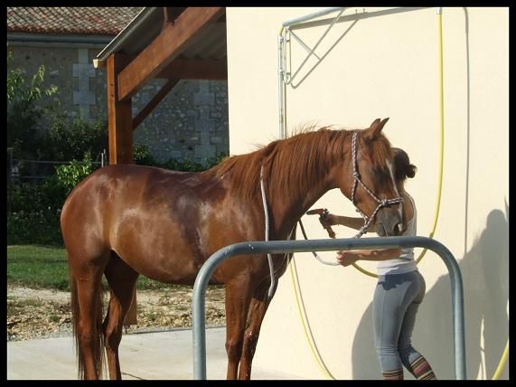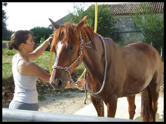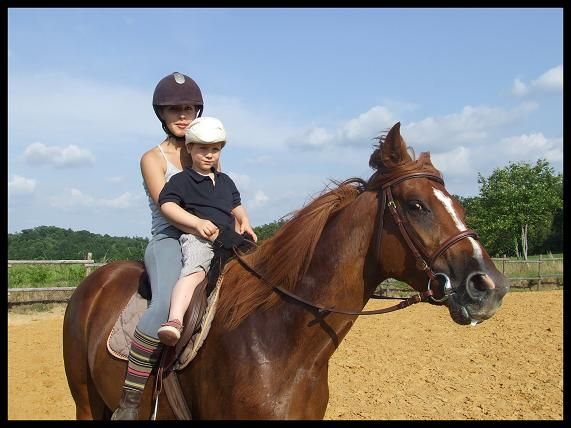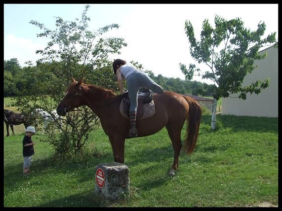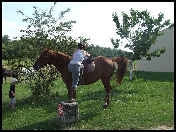 | Dire merci | Bon un résumé RAPIDE car si je met un roman vous aller pas lire je vous connais Donc WE dernier, j'y suis aller mais grosse chaleur et une saleté de tique a piqué Queen pas loin du passage de sangle donc par sécurité j'ai preferé pas monter. Par contre j'ai bosser rapidos dans le rond de longe a pied : reculer, premier essai de jambette ( c'est pas gagné .. ) et puis gros pansage !!Il y a 2 nouveaux à la pension le Mérens qui devait etre avec les 4 autres dans le grand prés et une petite arabe seule dans un paddock car vieille donc par sécurité. En fin de compte le mérens et la jument des proprietaire de la pension ont été mis a part dans un 2eme paddock car le mérens chargé un peu. Et ça devenait dangereux pour nourrir et sortir nos chevaux du prés. Donc résumé : ils sont 3 dans le grand prés ( dont Crapaud ), 2 dans un paddock, et la petite arabe toute seule. Sinon j'ai une amie qui l'a monté avant hier et je suis vraiemnt fiere de ma belle. Vraiment c'est pas evident de laisser une amie monter Queen ( meme si je lui fait entierement confiance et tout et tout ) mais en faite javais peur que Queen ne soit "pas pour elle". Vu que bon elle est "faite" a ma main. Elle l'avait monter au tout debut.Bah j'ai eu que des compliments Une jument vraiment bien au boulot, une vrai creme au pansage. Apparement j'ai vraiment fait du bon boulot avec elle. Ca m'a fait chaud au coeur. La j'ai fini mes cours, enfin il me reste un oral mardi et aprés je rentre. Jai toujours pas de travail pour le mois de juillet ( ) mais au moins ça me permettra detre beaucoup plus avec elle.![]() Moi qui voulait faire cours .... Loupé !! Bon aller j'ai quelques photos pour vous . |