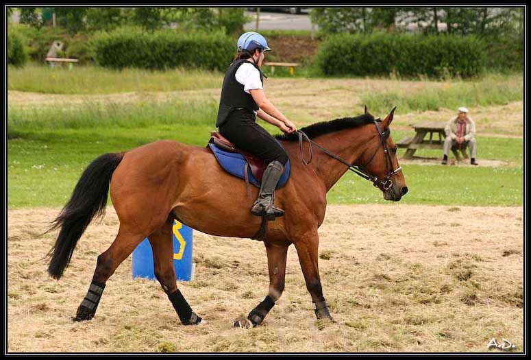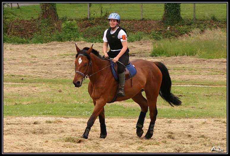 La maitrise des allures se passe moyennement. Il y avait un couloir délimité par des lignes blanches et une petite ligne blanche qui "fermait" le couloir. Résultat j'arrive petit galop et Lann Bi saute