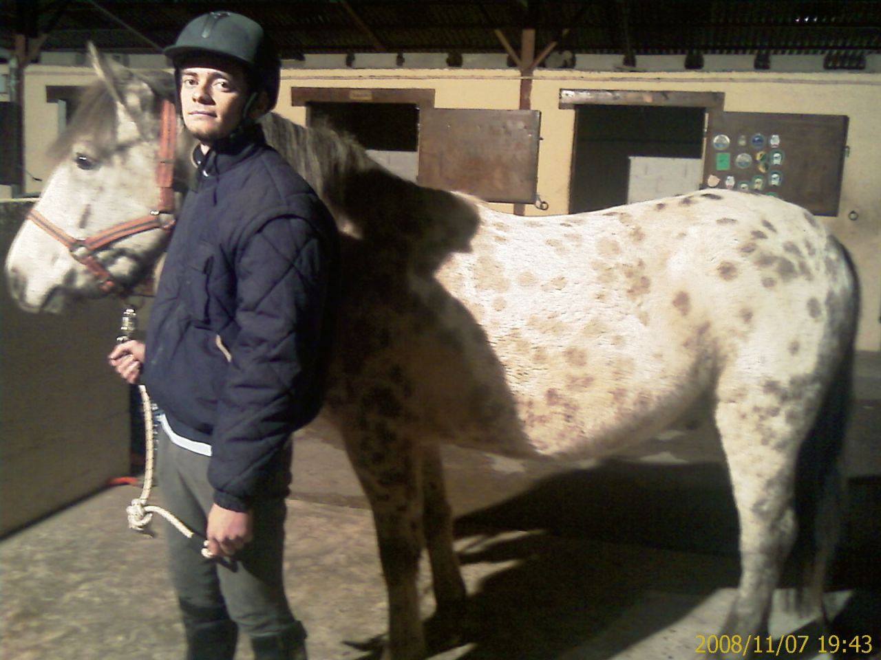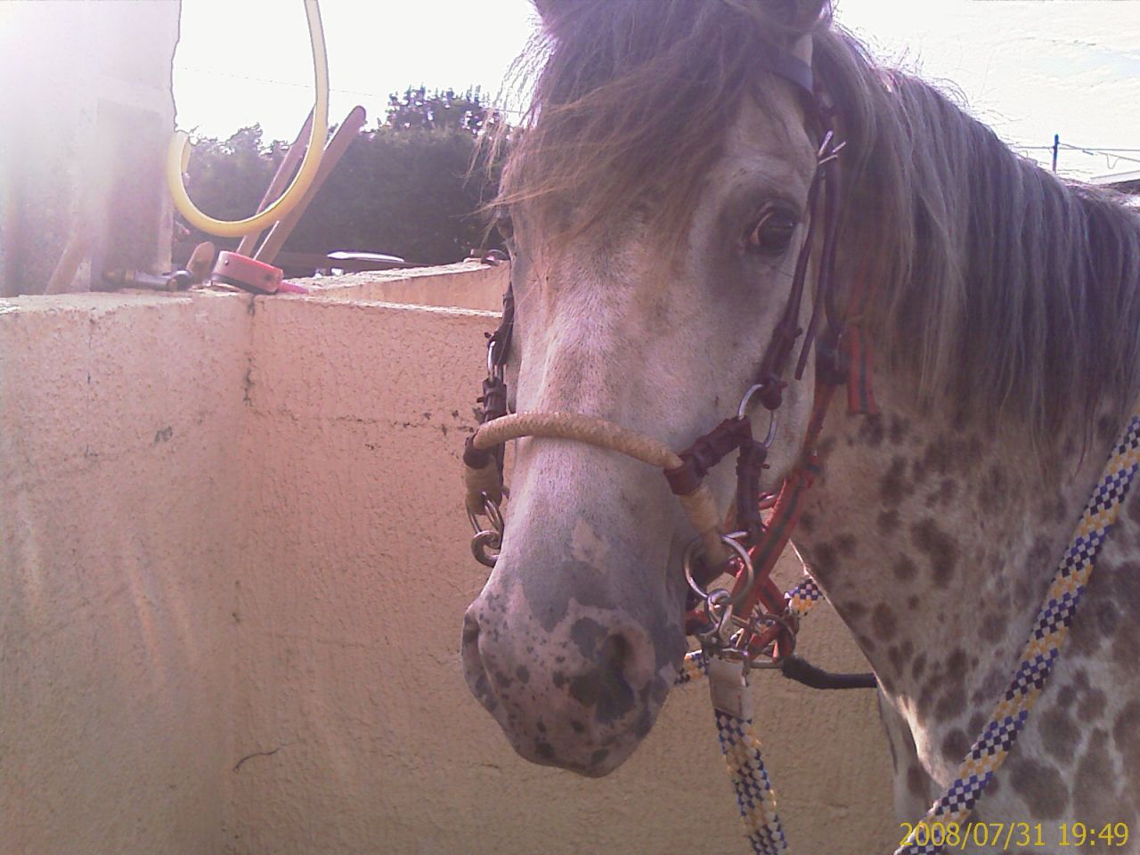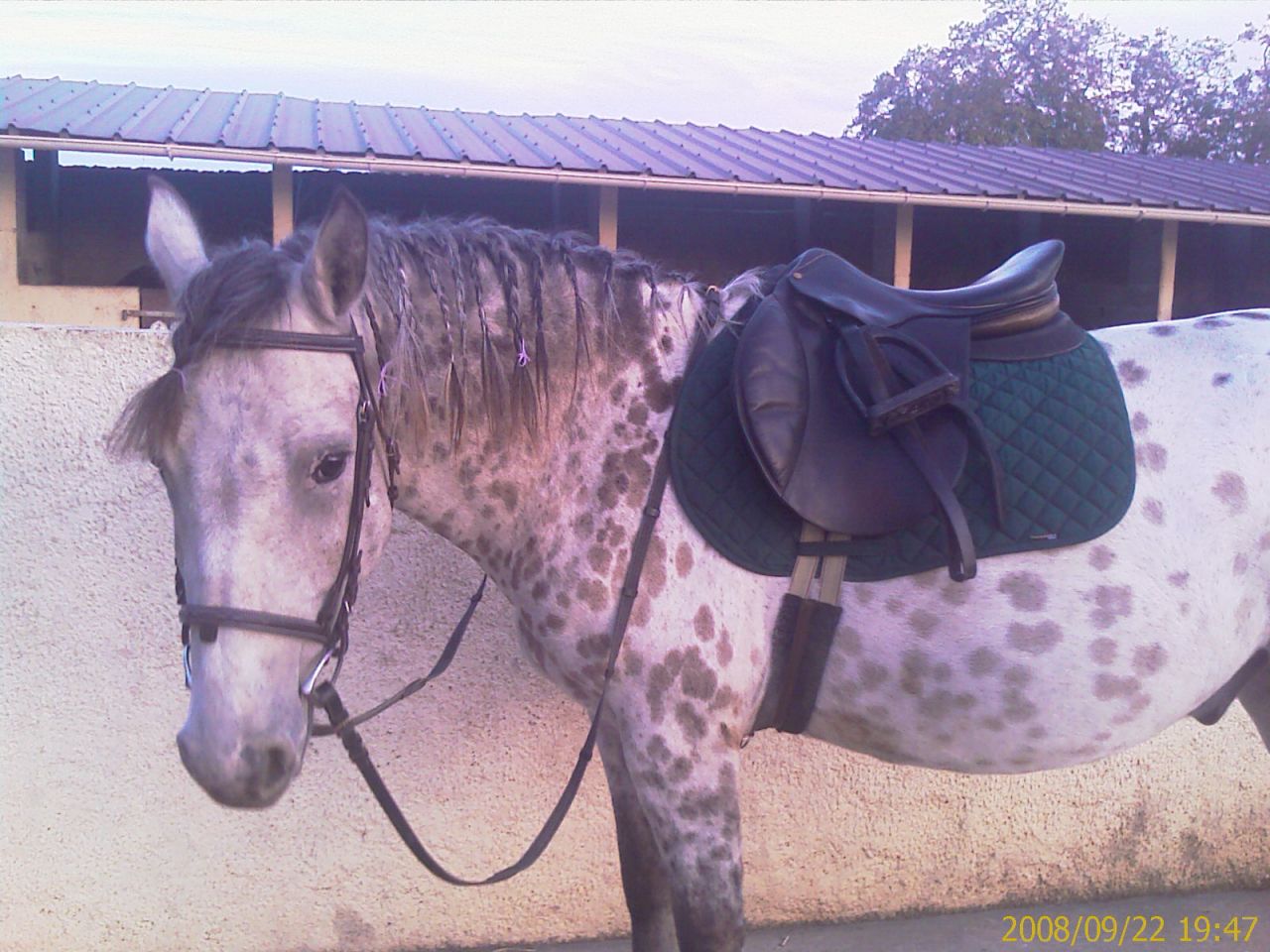 | Dire merci | ensuite, plein de progrès: quezzac en ballade en groupe ou seul: vraiment poney de trec: passe partout, peur de rien ou presque, jamais québlo sur un truc (du genre: "haaa! une tache au sol!" ou "haaa! une flaque d'eau mangeuse de poney!" , par contre manque d'endurancej'ai même pu galoper en extérieur seule, c'était tranquilou! une fois aussi mon homme m'a accompagnée avec notre chien, ben il a pas peur, donc c'est super! lundi soir on a fait un travail sur l'incurvation: j'ai rien senti, mais rien de rien, j'y arrive pas et quezzac avait beaucoup de mal aussi. S'il s'est un peu incurvé, je suis pas au courant. et puis incurvation au galop et là, quand j'ai perdu un étrier et que j'ai décidé de faire sans, ben le moniteur il m'a dit que d'un seul coup c'était mieux! donc hier (jeudi) soir, toute seule, j'ai galopé sans étrier dans le manège (qui lui donne encore du mal car encore un peu petit pour ses virages au galop!). Au moins j'ai réussi à galoper! Mais boudiou, j'ai eu mal au adducteurs!! en plus, j'ai tellement confiance en lui que j'ai galopé pour la première fois dans le manège, sans étrier et avec le side-pull! bon je me suis pas prise en photo pendant le galop, mais je vous ai pris des photos d'avant, quand lui avait posé le side, donc place aux photos: |