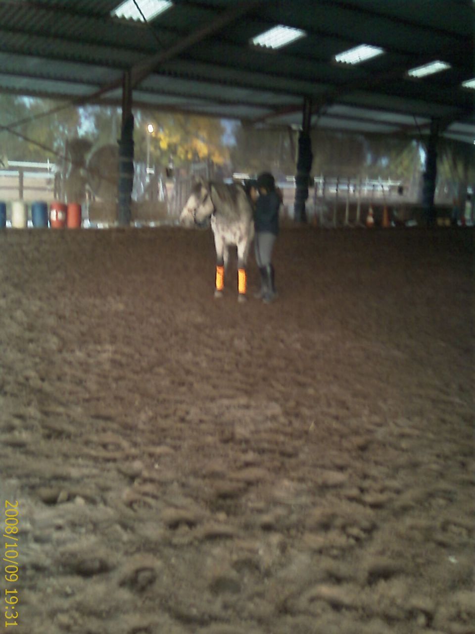 | Dire merci | update: Lundi, séance de trec habituelle: séance pour tous les deux. En plus, le moniteur n'était pas d'humeur, donc ça aide pas.Hier soir, toute seule (enfin je partageais le manège avec un autre proprio): séance EXTRA! On m'a donné hier soir des bandes de travail (Quezzac faisant une réaction irritante au sable du manège et de la carrière ), elles étaient orange FLUO. JE les ai posées, on a commencé à me faire des blagues du genre "vive la DDE!", donc je me suis dit, autant continuer dans le freestyle et j'ai mis le side-pull avec les rênes en coton.. bien m'en a pris!Quezzac a été super à l'écoute presque tout le temps, trot certes un peu rapide, mais galop quasi cool, presque fait tous les coins (manège de 40x20) sans speeder, bref, du bonheur! la direction à une main (l'autre devrait tenir une carte, trec oblige!) ça vient bien aussi... j'étais hyper contente! Et mon homme était là! Du coup il a pris des photos... je ne les ai regardées que ce matin et je me trouve pas top du tout... mais comme y'a mon pti père dessus avec ses super bandes fluos et son side-pull, je vous les mets quand même! |