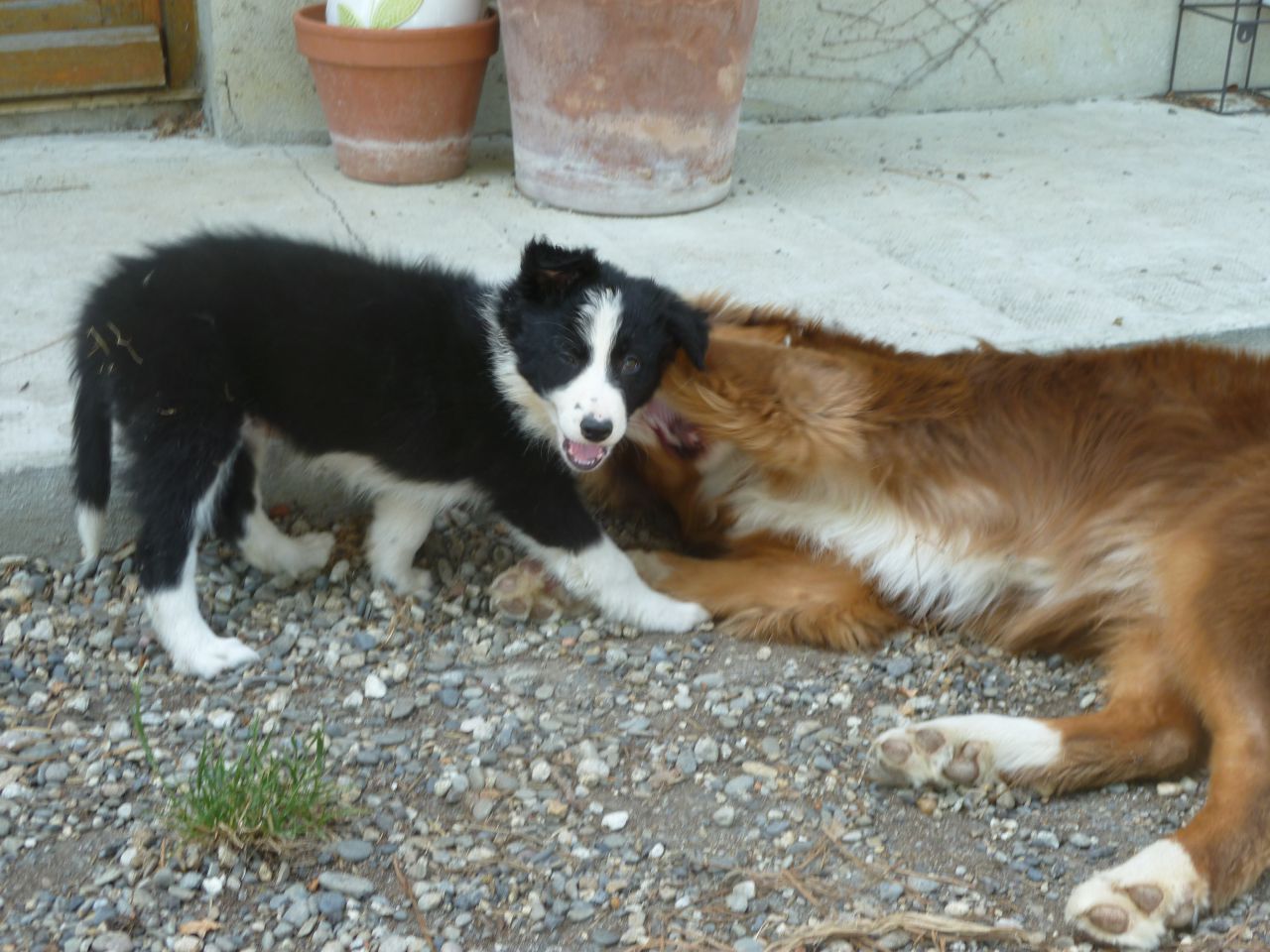 | Dire merci | viiiii, trop contente parce que c'était un vrai déchirement quand j'ai décidé de faire partir Dash pour s'occuper d'un grand troupeau. Chez moi j'avais pratiquement plus de moutons et elle vivait pour ça, c'était plus fort qu'elle. Mon formateur de chiens au troupeau a trouvé une ferme en Espagne où elle travaille tous les jours toute la journée, c'est exactement ce qu'il lui fallait. Mais je suis très contente d'avoir pu récupérer un de ses chiots, yeah !! ![]() |