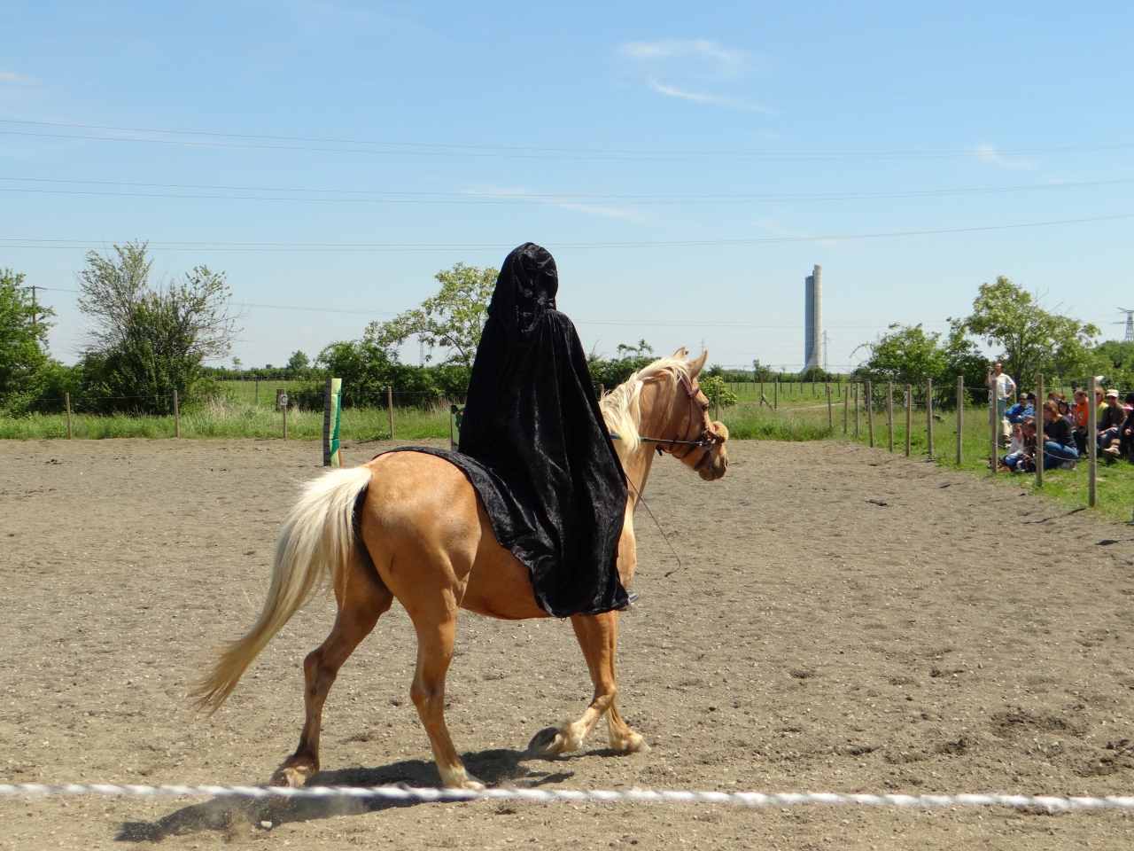 | Dire merci | Le prince joue son rôle à la perfection et Blanche Neige se réveille. Un peu groggy quand même, donc en bon prince il la fait monter sur son beau destrier, Quallisto![]() qui (ayant lu le script) cabre de joie ![]() avant de se mettre à genou devant son prince ![]() Et voilà donc, tous les chevaux et tous les cavaliers ont vécu longtemps et heureux... ![]() |