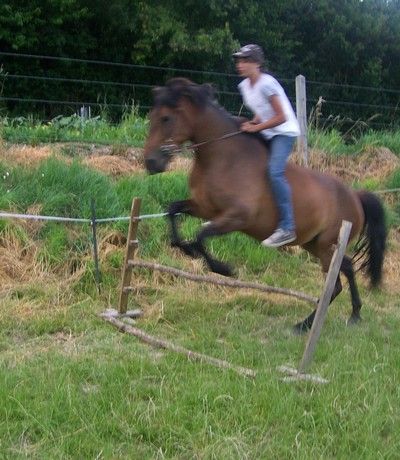 | oui ben justement la jamais mit une barre d'1m pour faire comme une sorte de porte et elle continuait à brouter quand tous d'un coup elle a eu une crise et est venue au galop sautait la barre j'ai halluciné .  |