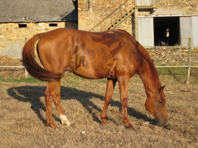 Déconnecté | Bon apres 6 mois de tranquilité de santé (sauf la petite frayeur apres un TREC) Môsieur Opige a un poteau sur son postérieur blanc ... Et il a rien pas de boiterie, pas de douleur !! Ca a commencé par le jarret ce matin donc un sachet d'équipalazone avec la ration et ce soir c'était descendu sur le canon et ca commencait a prendre le boulet donc on lui a mis deux sachets de ... je sais plus !! Enfin bref + douche + argile avec teinture mère d'arnica !! Demain matin on douche, on prend la température (rien ce soir) et on remets arnica + argile ... Je pense a un coup de pied de son copain mais pas de trace ... donc on va voir comment ca évolue ... |