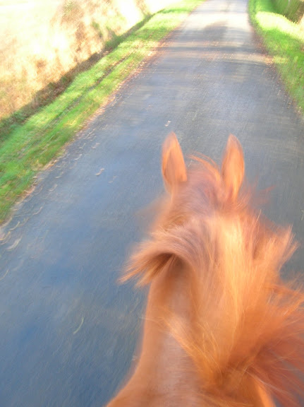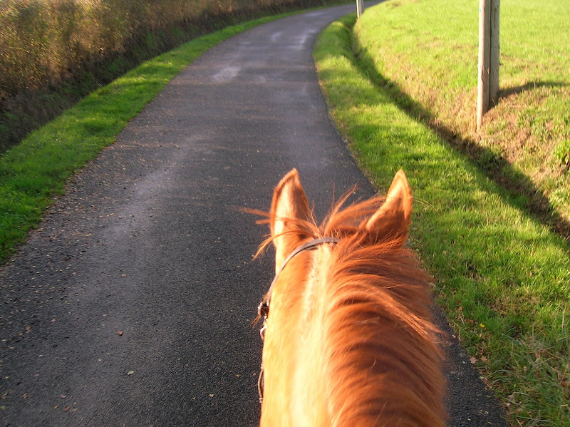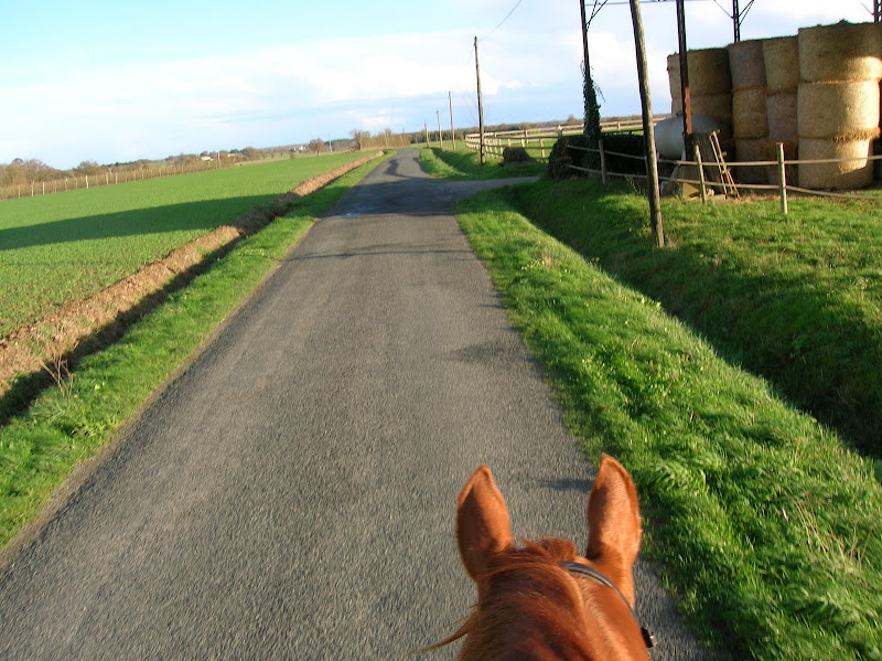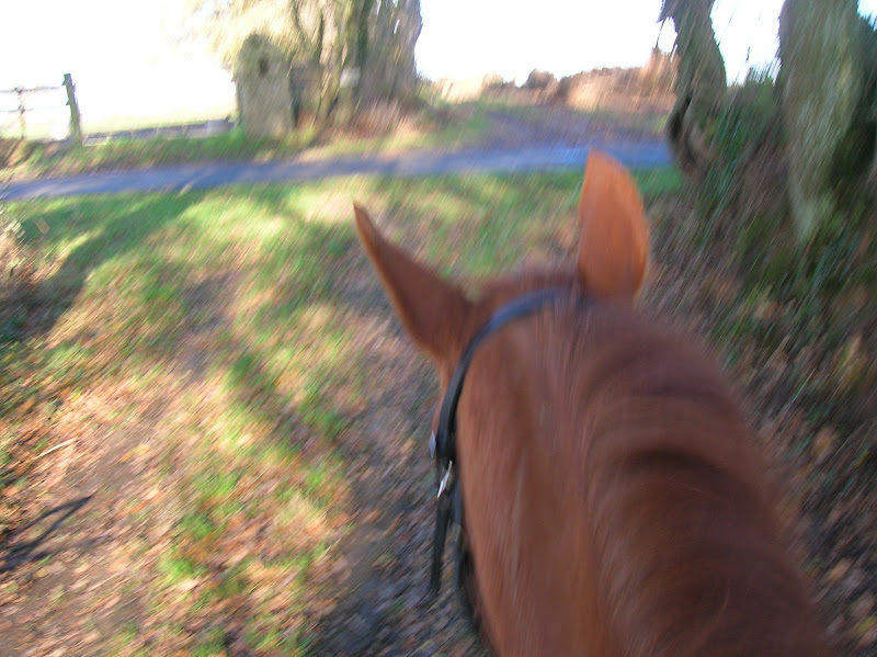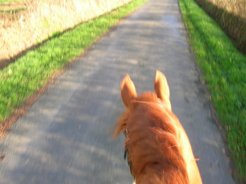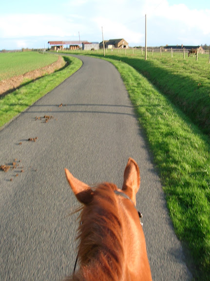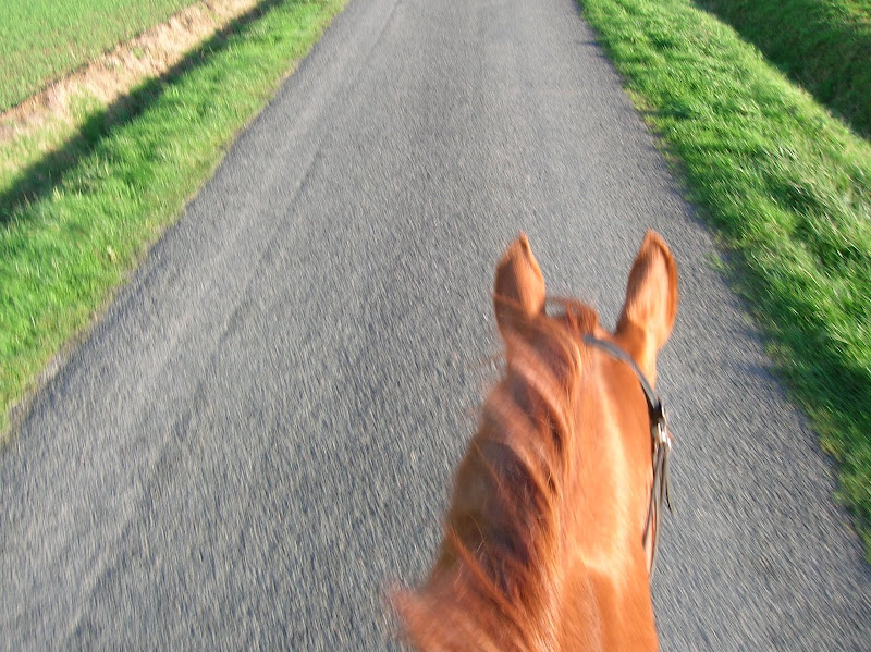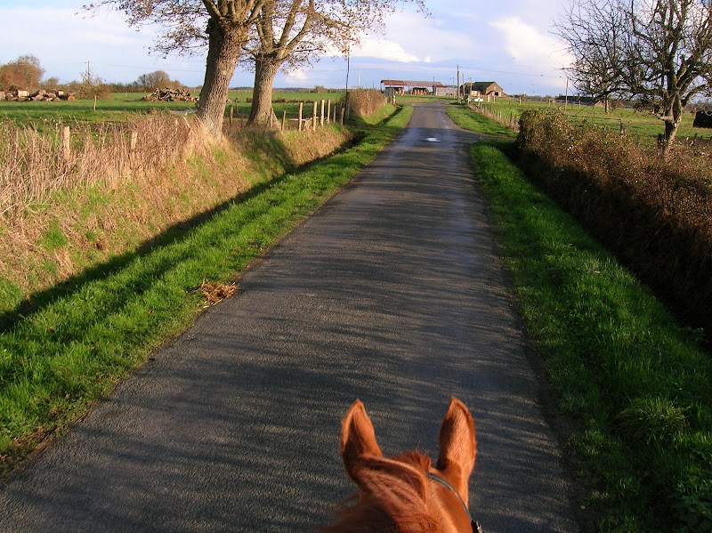 Déconnecté | Donc je disais !! Aujourd'hui ballade sous un beau ciel ... on a refait le chemin qui pose problème au jaune et mis a part le début et quelque viles tentatives de retour direct au haras il a été mimi !!! Un petit chemin qui mene a rien sauf des vaches qui font cre cre peur ! Mais ya un copain alors ca fait moins peur ! L'orange !! |