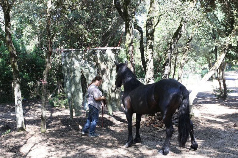 | Dire merci | Donc Dimanche, je decide de bosser a pied la Colomba, qu'elle apprennent a ceder meme quand ca fait trop peur, qu'elle prenne confiance dans les demandes que l'on peut lui faire a pied. Et pour cela rien ne vaut un monstre mangueur de chevaux, le rideau vegetal ![]() ![]() l'approche est tres hesitante, mais pas a pas elle s'approche, je la felicite a chaque fois ![]() HAAA ca bouge.... elle a eu un geste de recul que les lamelles sont sont animés sous l'effet de la brise ![]() mais petit a petit, elle en vient a toucher du nez le rideau ![]() La tete, est quasi passé, elle semble calme ![]() Mais a peine passé la tete c'est tayo, elle fonce pour en finir au plus vite ![]() mais elle respecte la longe et revient vers moi ![]() ![]() |