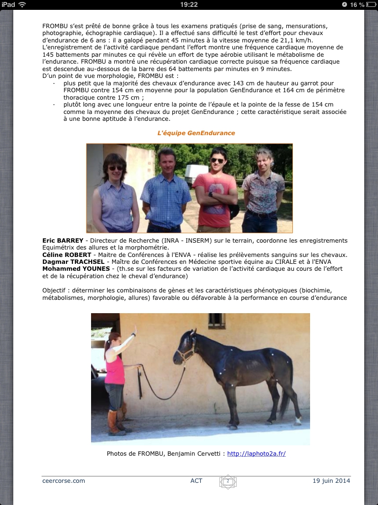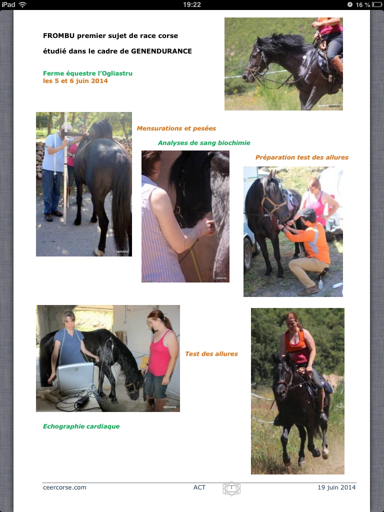 | Dire merci | L'équipe des vétos se sont tourné vers le Gecec, association d'éleveurs de chevaux d'endurance, pour obtenir 15 jeunes (des 5 et 6ans) chevaux courant en Endurance, Frombu était sur le listing possible, la présidente m'a demande si cela m'intéressait, et j'ai dit oui... En plus l'association de race corse, apprenant la chose m'a contacté pour que j'accepte mais ça c'était déjà fait Message édité le 06/06/14 à 23:43 |