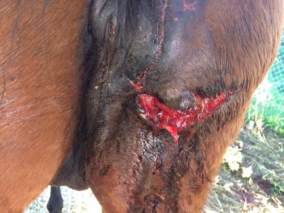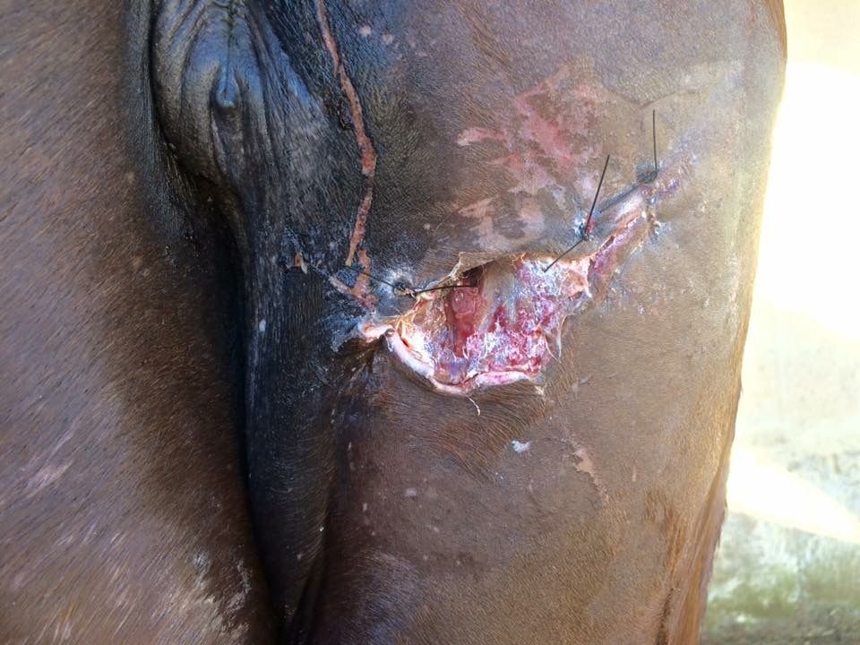 | Dire merci | Manzzana a décidé de s'y prendre en avance pour le vendredi 13... Ce matin en allant nourrir, je lui trouve ceci Et la bien contente d'avoir mon van... Hop dedans direction la clinique véto Il l'a recousu comme il a pu car les bords était trop abîmé pour pouvoir le faire entièrement Je vais devoir lui trouver un box, car faut limité au max ses mouvements pour me moments. Le seul point positif, c'est que cela n'aura aucune incidence sur sa locomotion une fois guéri, elle ne boîte pas et pose par gaiment le membre |