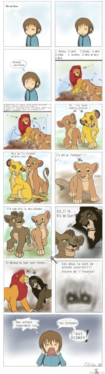 | Dire merci | Sheyt je suis ok avec toi, mais la lionne mere de Kovu, appartenait bien au groupe de Mufasa et elle a ete chasse car reste fidele a Scar sachant qu'il n'y avait que Maufasa et Scar en male dans le groupe.... le probleme se pose quand meme ![]() |