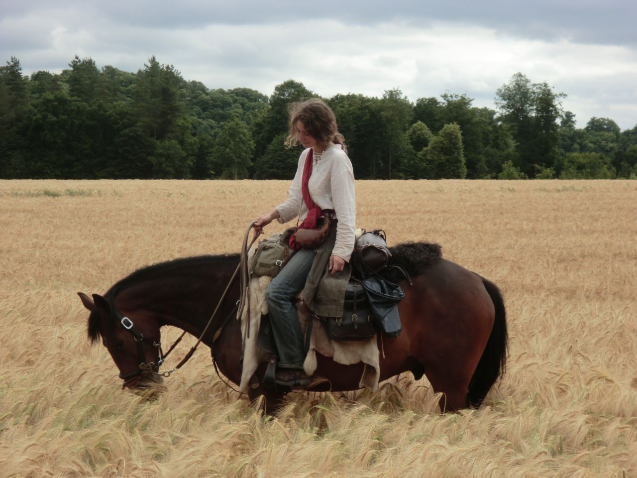 | Dire merci | Nous retournons au jour 23 de notre aventure, où nous nous éveillons derrière notre botte de paille au son des camping-cars et des camions qui ont commencé leur rué vers le concours de pêche. La journée commence par des tartines de pain au miel trempé dans le café : Eden réclame sa part. Pouletto est libéré et part à la chasse aux sauterelles. Merlin et moi jouons comme des gosses à sauter sur les bottes de paille, et le jeu dégénère en une partie du roi de la botte, qui consiste à dégager violemment votre prétendant au trône de paille. Devinez qui perd. Je me retrouve suspendue par un pied, la tête en bas, à hurler de rire pendant qu’il me chatouille (je sais, c’est horrible), sous le regard consterné des pêcheurs russes, hawaïens, slaves ou polonais qui se succèdent sur le chemin. Merlin décide ensuite que le moment se prête bien à une séance de perfectionnement à cru avec Eden. Eden décide que non. Me promenant tranquillement au fond du pré avec Pouletto pour l’aider à attraper des sauterelles de petit-déjeuner (elle est un peu nulle), je vois Eden courir vers nous en mode trotteur de l’enfer, exécutant au galop des pas chassés en même temps que des sauts de moutons, avec Merlin sur le dos très occupé à ne pas mourir, et à garder ses organes génitaux intacts. Par miracle, tout le monde s’en sort indemne, organes compris. Eden, même pas mauvais, à l’air plutôt content, et nous sert son regard de « hahaha c’était marrant, tu sais pas monter du tout en fait ! On le refait ? » Je selle le bougre, et pars en mission flotte pendant que Merlin emballe nos affaires. Pour lui apprendre un peu, et aussi pour frimer un max devant la gent masculine qui s’amalgame sur les berges, je le lance dans un grand galop vers le campement des pêcheurs. Malheureusement, son humeur n’a pas changé, il me rabat mon clapet en virant brusquement dans un champ dans un virage serré, avant d’essayer de prendre le large : « Ouiii ! Courir à fond, mais quelle bonne idée ! VERS L’INFINI ET AU DELAAAA ! ». J’ai toutes les peines du monde à le ramener vers le camp sans cassage de gueule, et ce sont des types hilares qui me servent mon eau. Bien obligée de sourire en voyant Eden plonger son gros nez dans le seau en m’aspergeant le jean, puis demander des friandises à tout le monde (il se rappelle du pain offert la veille). J’avais qu’à pas faire ma maline, là ! Départ sous un nouveau soleil, dont la lumière se teinte subtilement d’or poudreux au fil de l’avancée de l’été. Les journées de cagnard blanc nous semblent déjà loin. Nous reprenons les petites routes longeant la vallée fluviale cultivée que nous avons suivi plus tôt dans notre voyage, retraversant avec émotion les mêmes paysages sur une demi-douzaine de kilomètres. Au niveau de Bocquereu, nous quittons nos traces pour obliquer plein nord vers La ville au Vent (pour le plaisir du nom), avant de mettre le cap au nord-ouest, direction les landes de Lanveaux. Sur la route, nous dépouillons un cerisier aux excellents fruits jaunes, et je mets la main sur un grand bâton qui me donne une super idée. Je vais – encore, hélas – réinventer l’équitation. Mon enfance a été hantée par ces illustrations campagnardes naïves, où l’on voit un mouchard au joues rouges et à l’air exagérément choupi monter un petit âne en l’appâtant avec une carotte pendue par une ficelle à un bâton. La chose est-elle seulement scientifiquement possible ? La suite de nos aventures nous prouvera que oui, quand un Eden rendu furieux lancera de grands coups de dents frustrés vers la baguette qui pendouille au bout de ma perche, manquant de prendre son trot de combat pour attraper la bouffe qui se dérobe devant ses pas. Amarré par la longe au vélo de Merlin pour affronter une côte, il illustrera brièvement et dans toute sa gloire un monument parmi les clichés ruraux de mauvais goût. La blague ne durera pas : il finit par choper la baguette et manque d’avaler la ficelle avec, dans son empressement. Dans ma grande sagesse équestre, j’en conclus que cette nouvelle alternative à l’impulsion de la jambe présente un avenir techniquement limité. Il faudrait une putain de réserve de baguettes. |