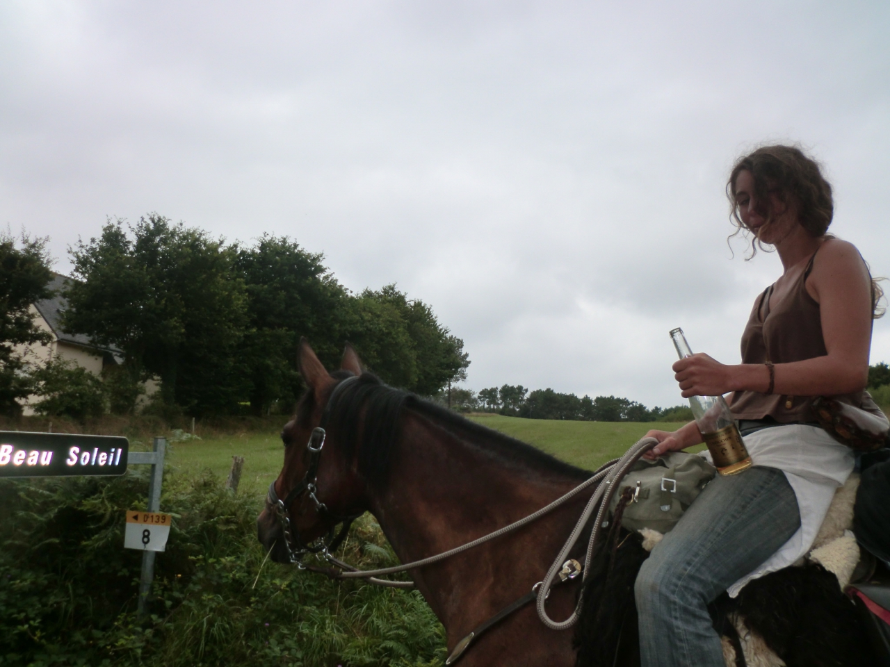 | Dire merci | Nous faisons tranquillement route vers Molac en longeant le ruisseau de l’Arz. Nous circulons dans de jolis bocages humides, et Eden tout excité s’essaye à une nouvelle technique qu’il a mis au point pour me porter sur les nerfs et me convaincre de le laisser courir : le Pasgalop. Je le monte toujours rênes longues au pas, et pour l’empêcher de trottiner, au lieu de raccourcir les rênes tout le temps, je les reprends d’un coup, en lui mettant un petit coup de pression sur le nez, aussitôt relâché : c’est non. Sa réplique consiste désormais à se lancer dans des espèces de mini-foulées de galop des antérieurs, tandis qu’il marche toujours de l’arrière main, ce qui lui donne l’air de se presque-cabrer tous les deux pas. Merlin trouve ça plutôt joli. On voit bien que ce n’est pas lui qui se retrouve à monter un gros Kulbutoké fou. Le loustic se calme généralement après une bonne claque entre les oreilles. Nous parvenons bientôt dans le village de Molac, dont le nom nous donne le fou rire, sans raison particulière. Prononcez : MôlaK en marquant bien le K. SexyBoy nous avait prévenu : c’ est un village rustique. Bon, à vrai dire, ses mots exacts étaient « un bled de cassos ». Bon. Cassos ou pas, ils nous serviront bien un petit goûter. Nous passons dépités devant la pizzeria fermée, pour nous rabattre sur le bistrot. Aux tables de la terrasse sont attablés quelques jeunes types, qui s’exclament en nous apercevant. On commence à avoir l’habitude, et nous restons souriants, en nous installant pas trop loin. Pendant qu’on sirote nos cafés, l’un des types, un individu de type « tunning » commence à parler plus fort que les autres. J’étouffe un fou rire dans mon café. Le mec s’amuse comme un petit fou, commentant chaque geste d’Eden : « Non mais en vrai jte jure les cheval c’est trop intelligent ! Regarde, gad’ y bouge sa patte gauche, chuis sûr ça veut pas dire la même chose que s’y bouge la patte droit’ ! » En effet Eden est en train de « donner la papatte » pour avoir du café, un tour débile que je lui ai appris et qui sert à faire rigoler les enfants, surtout. Et le mec de continuer : « Nan mais regad’ ses oreilles ! Chuis sur y lui parle, il lui parle en cheval avec ses oreilles, c’est un code secret ! Pis la fille t’sais elle lui répond! Eh cheval ! Ehh ! » Merlin et moi sommes morts de rire, et le mec continue son cirque, ravi d’avoir l’attention générale. Il essaye bientôt de donner un sucre à Eden et joue exagérément la frayeur. Nous quittons la place le sourire aux lèvres, et sortons doucement du village. En chemin nous croisons des visages ravagés. L’alcool semble faire de gros dégâts dans ce coin. |