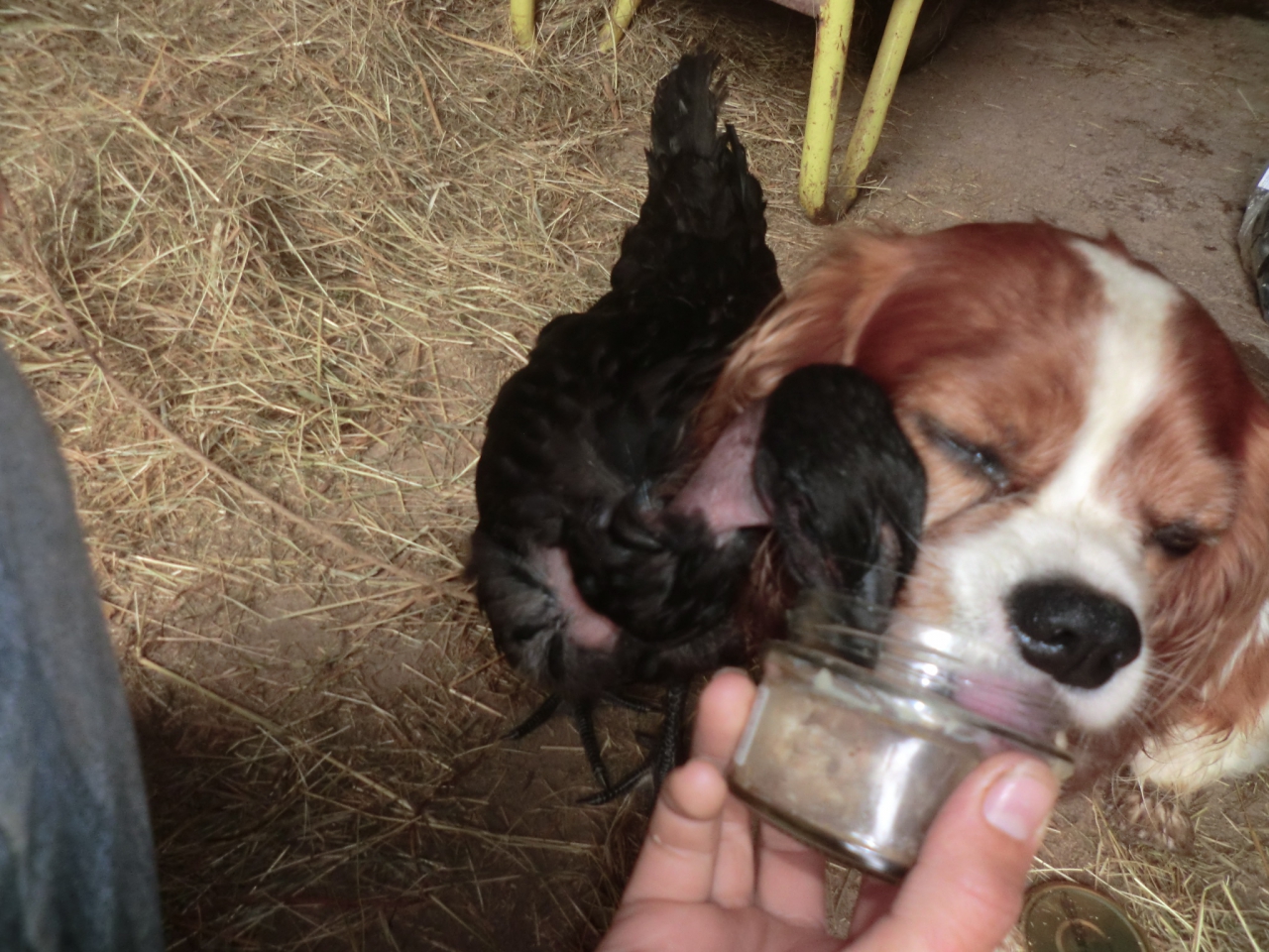 | Dire merci | La date du grand retour approchant, nous décidons de mettre le cap au sud-est, vers Muzillac, où j’ai donné rendez-vous au transporteur. Nous flânons sur de petites routes de campagne, évitant les grands axes et prenant soigneusement notre temps. Le temps est doux, le ciel voilé, et la mélancolie de la fin de vacances pointe son nez, teintant notre insouciance habituelle d’un vague à l’âme bien connu, celui qu’on ressentait, gamins, à la fin de nos étés. Sur la route, nous croisons une ferme où je me fais offrir de l’aliment pour bovin par un paysan (Eden a déjà fini ses rations : comme il a perdu un peu de poids je ne lésine pas sur la dose). Le bougre tente d’abord de me vendre son seau dix euros, et de dépit, refuse la piécette que je lui propose à la place : c’est tout ce qui reste de ma fortune. Pis faudrait pas abuser non plus hein. Il me vante quand même son granulé, quand je lui demande ce qu’il contient : « Bah, c’est très bien hein. Pour votre bête, ce s’ra comme du chocolat ». Vu comme Eden se rue dessus à la pause suivante, je lui donne raison. En fin d’après-midi nous atteignons l’orée du village de Questembert, sous un ciel dégagé plein de lumière rousse. Nous croisons un pré abritant un magnifique selle français bai, marqué de grandes balzanes blanches, parfaitement musclé et nerveux comme tout. Une jument nettement moins altière l’accompagne, mais du coup on a pas retenu son apparence, tellement son collègue l’éclipsait. A l’autre bout du pré, nous apercevons les propriétaires, qui nous aperçoivent et nous font signe. Nous ne pensions pas nous arrêter tout de suite, mais ces gens ont l’air sympa : c’est parti pour un bivouac potentiel. Nous bifurquons à l’intersection suivante et rejoignons leur maison, attenant à leur pré. Le selle, tout excité, chante après Eden. Nous somme reçus avec un joyeux enthousiasme. La famille accepte immédiatement de nous héberger pour la nuit, et nous faisons connaissance. Le père de famille et sa femme sont des gens plein de vie, et leur jeune fille de 16 ans est l’heureuse propriétaire du beau cheval, avec lequel elle tourne en concours de CSO. La famille vit provisoirement dans une caravane, ayant entrepris des travaux de grande ampleur dans la maison. La grange nous est offerte, et pour Eden le petit pré individuel attenant, plein d’herbe d’été. Comme à son habitude, il se roule pendant que je m’occupe de lui remplir un seau d’eau, avant de se ruer sur l’herbe. Il est en mode «foutez moi la paix, vous marchez sur ma bouffe », alors j’abrège les câlins pour ranger nos affaires dans la grange. En fait c’est une grange de luxe : en plus du foin et du bordel classique, elle abrite un frigo et un clic-clac. Nos hôtes nous offrent gentiment la jouissance des deux objets, ce qui n’est pas rien : nous n’avons pas dormi sur un matelas depuis un bout de temps, et le frigidaire n’en parlons pas ; il est plein des restes d’une soirée d’anniversaire passée, et donc de petits pâtés et d’alcool. C’est la luxure la plus décadente, mais qui nous semble étrangement à propos pour reprendre pied avec la civilisation qui nous rattrapera dans trois jours. Nous sommes également invités à prendre une douche quand nous serons installés. Sur ces bons mots, et après un petit apéritif d’accueil pris en commun, nos hôtes nous abandonnent. Deux secondes plus tard nous avons la tête dans le frigo. C’est terrible. Il y a du pinard. Deux cubis. On a des verres. Vides. Une suite logique s’enchaîne à partir de là, nous amenant un peu plus tard à la porte de leur caravane pour profiter de cette fameuse douche dans un très joyeux état. Entre deux nous avons lâché Kinaï qui est parti à la rencontre de leurs deux beaux chiens, attachés au pied de la caravane par égard pour Pouletto, qui aurait fini croqué sans cette précaution. Un beau bouvier encore bébé nous saute au visage pour nous lécher les oreilles, et tente innocemment d’entrainer Kinaï dans une partie de papattes potentiellement mortelle pour ce dernier. Lequel se tire, pas si fou, préférant lever la patte avec ostentation sur les fleurs, sous l’œil méfiant de la vieille lévrier afghane qui garde également les lieux. Pouletto quand à elle, est attaché par la patte dans la grange, près du tas de foin qu’elle essaye de picorer. Elle nous a d’abord fait un scandale, avant de se résigner et d’explorer les lieux avec l’allonge autorisée. ![]() Pouletto et Kinaï partagent les restes de pâté. |